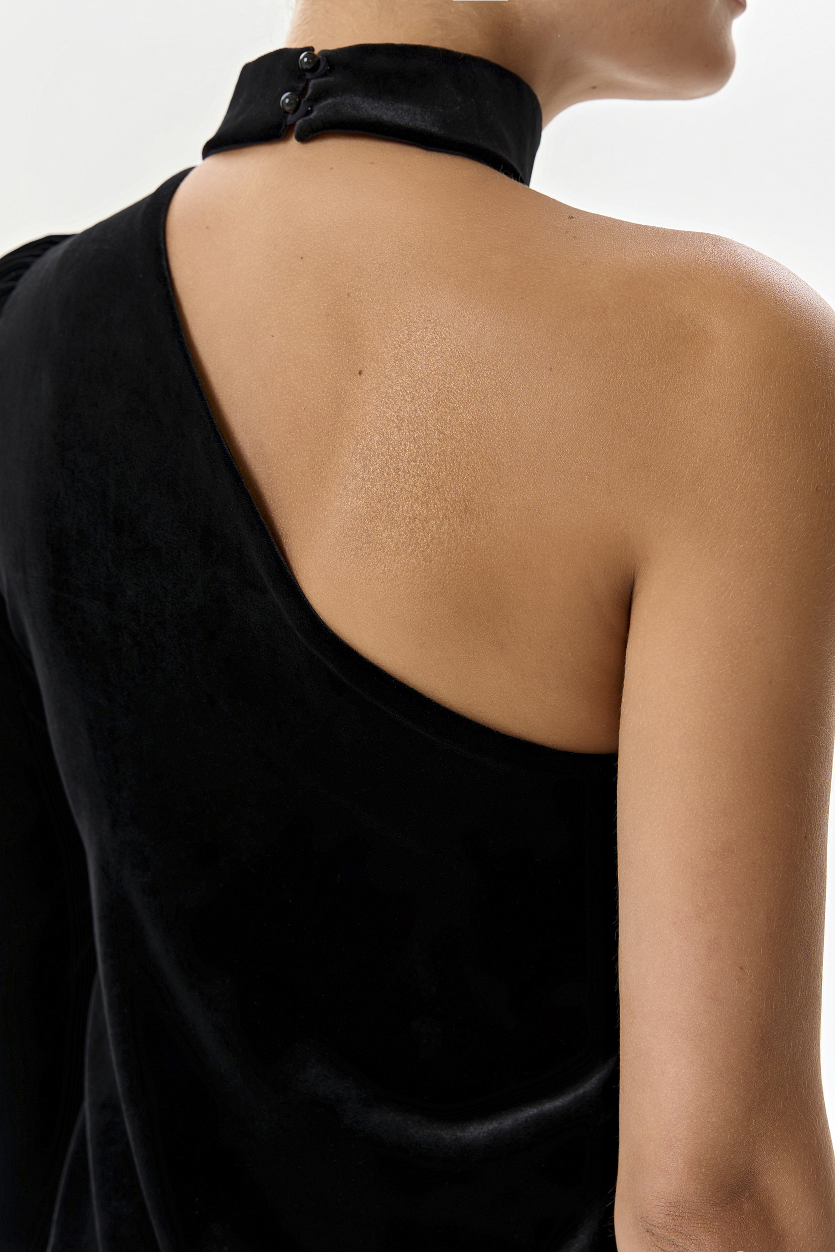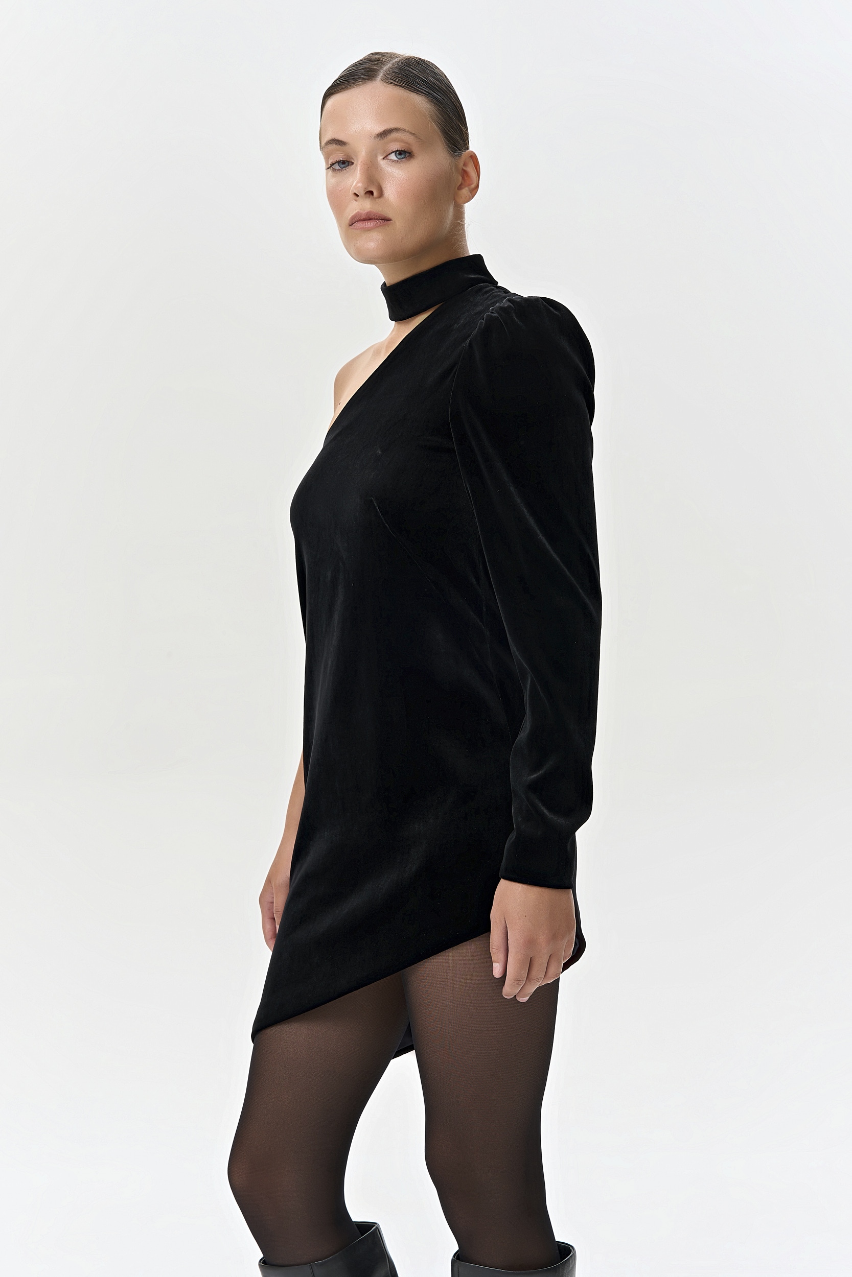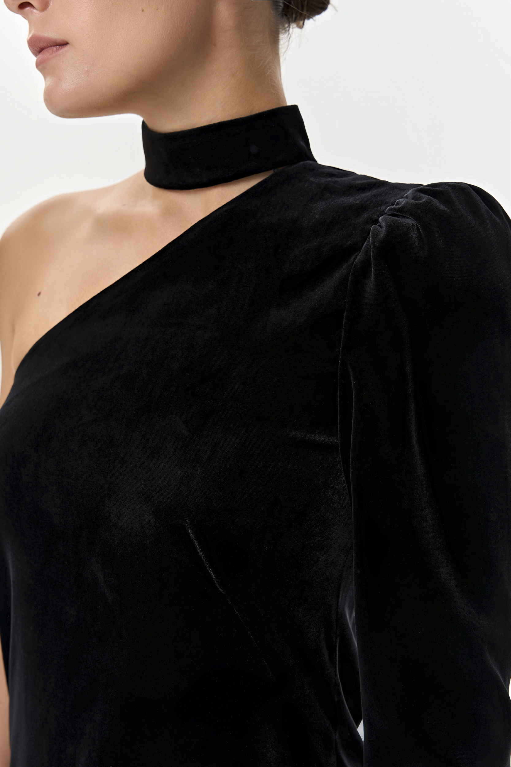 Черное асимметричное платье на одно плечо из шелкового бархата. Выглядит выигрышно благодаря лаконичному крою. Модель дополнена стойкой на шее и эффектным рукавом со сборкой. Асимметричный низ платья и открытое плечо позволяют выгодно продемонстрировать фигуру. Черное платье, которое не отвлекает от красоты женщины, а дополняет ее, сливаясь в единую композицию. Остаются только линии, тени, объемы и исходящая изнутри красота женщины.