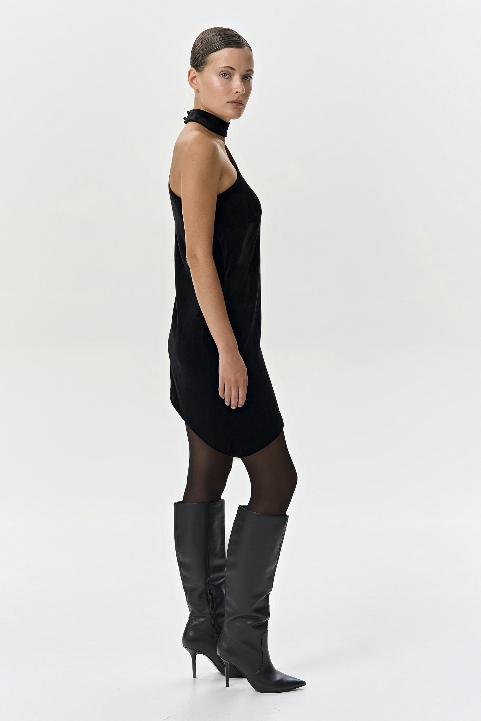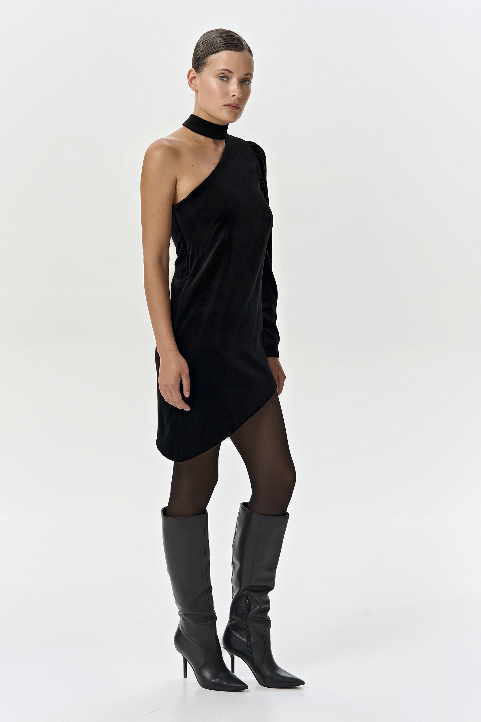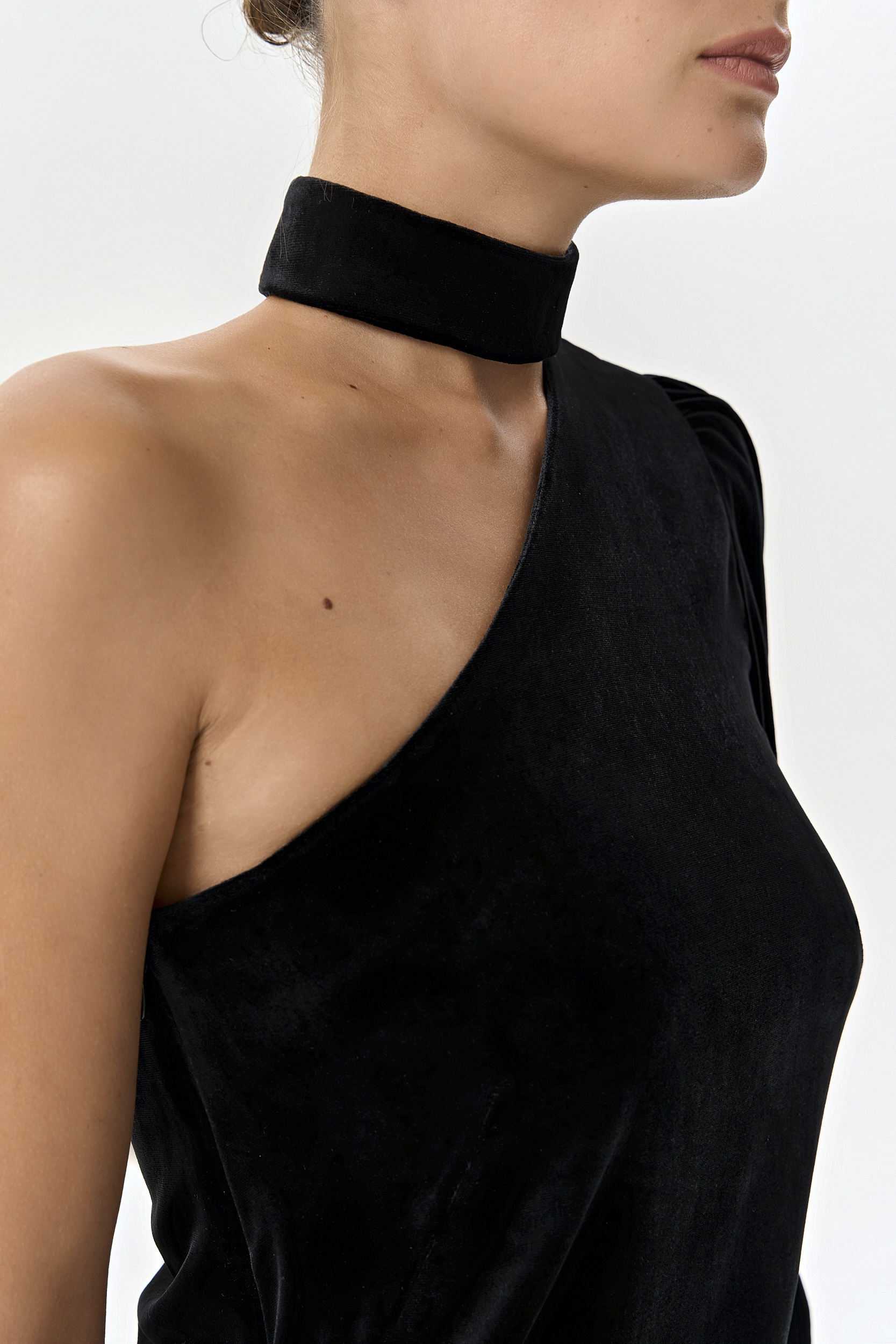 Черное асимметричное платье на одно плечо из шелкового бархата. Выглядит выигрышно благодаря лаконичному крою. Модель дополнена стойкой на шее и эффектным рукавом со сборкой. Асимметричный низ платья и открытое плечо позволяют выгодно продемонстрировать фигуру. Черное платье, которое не отвлекает от красоты женщины, а дополняет ее, сливаясь в единую композицию. Остаются только линии, тени, объемы и исходящая изнутри красота женщины.