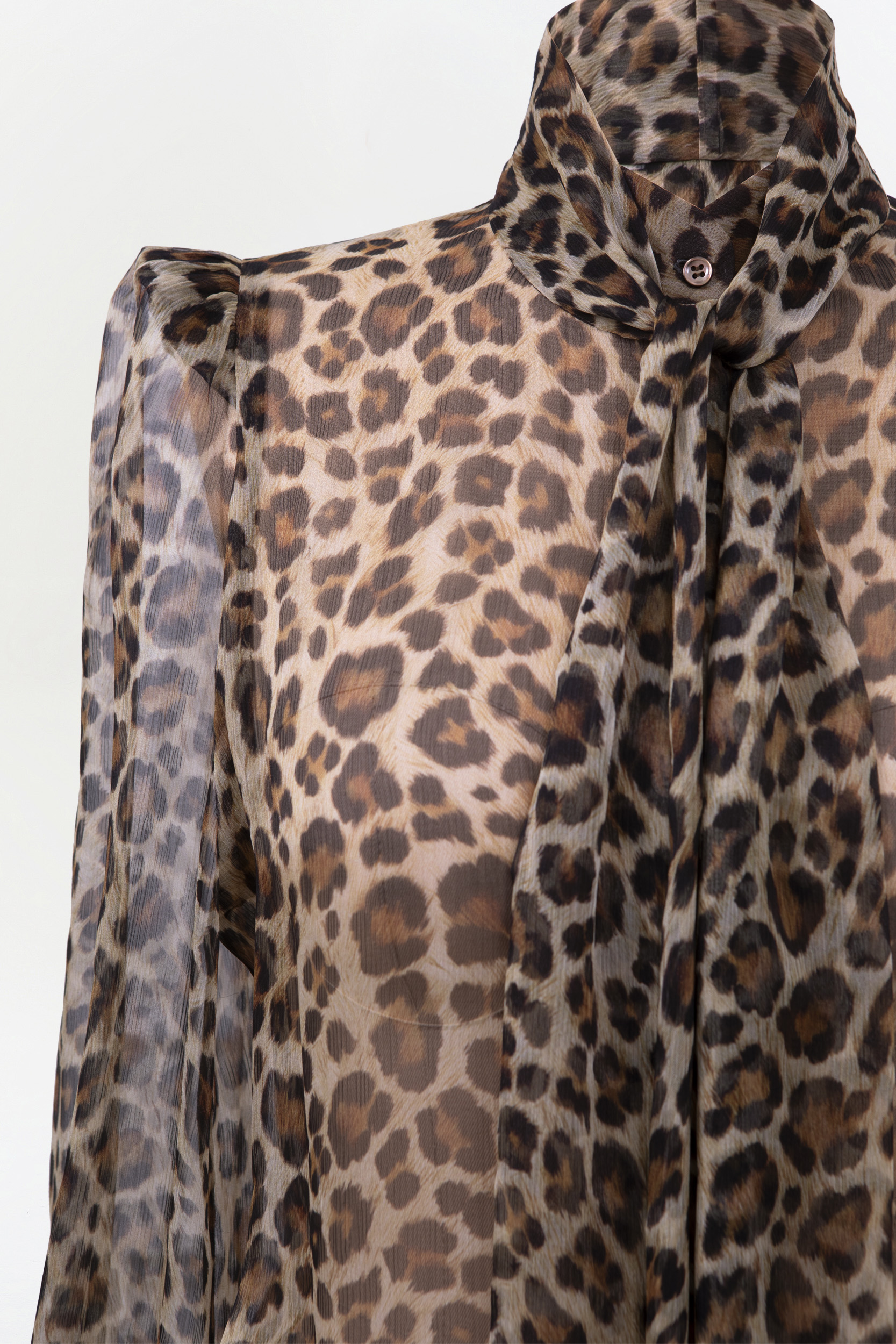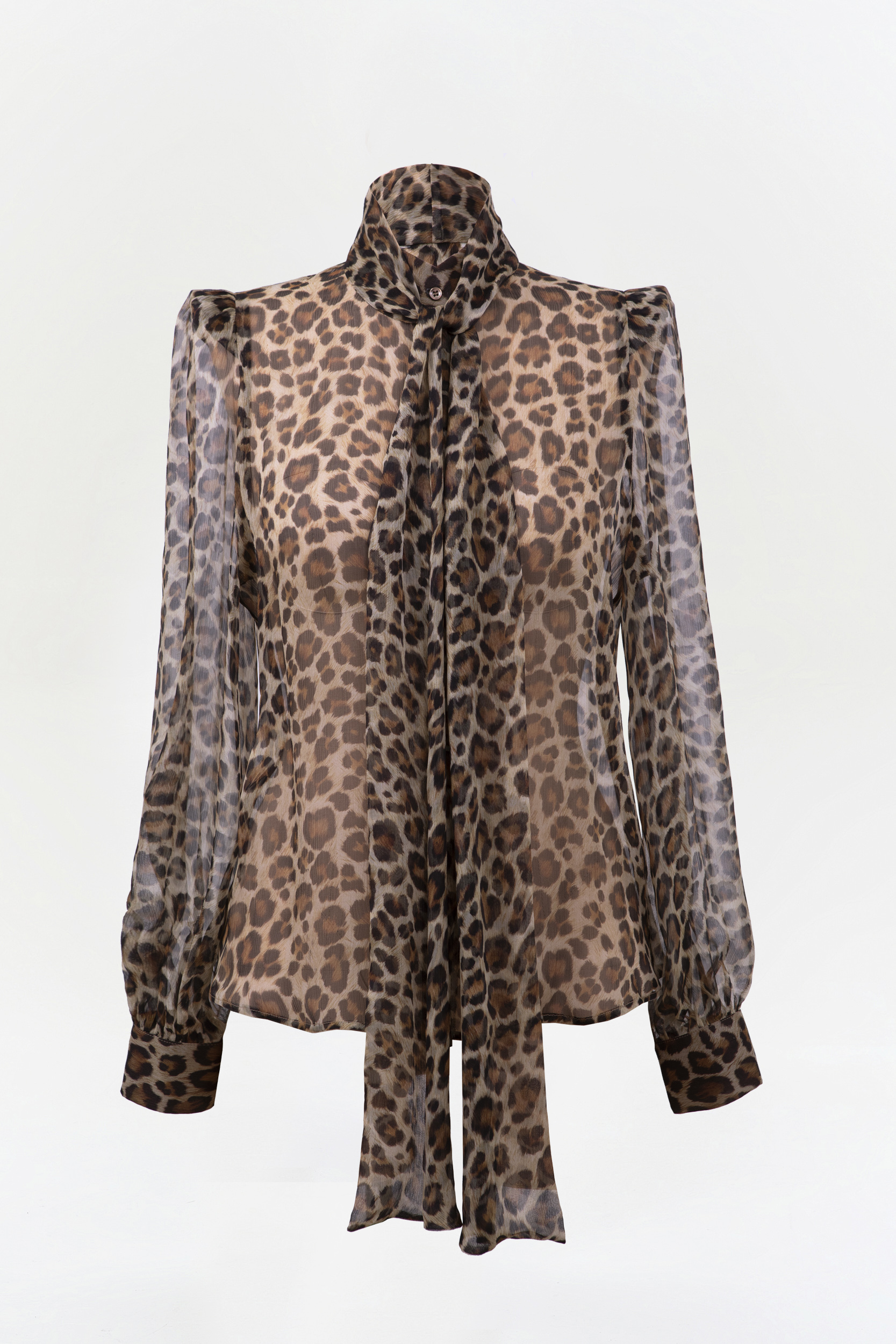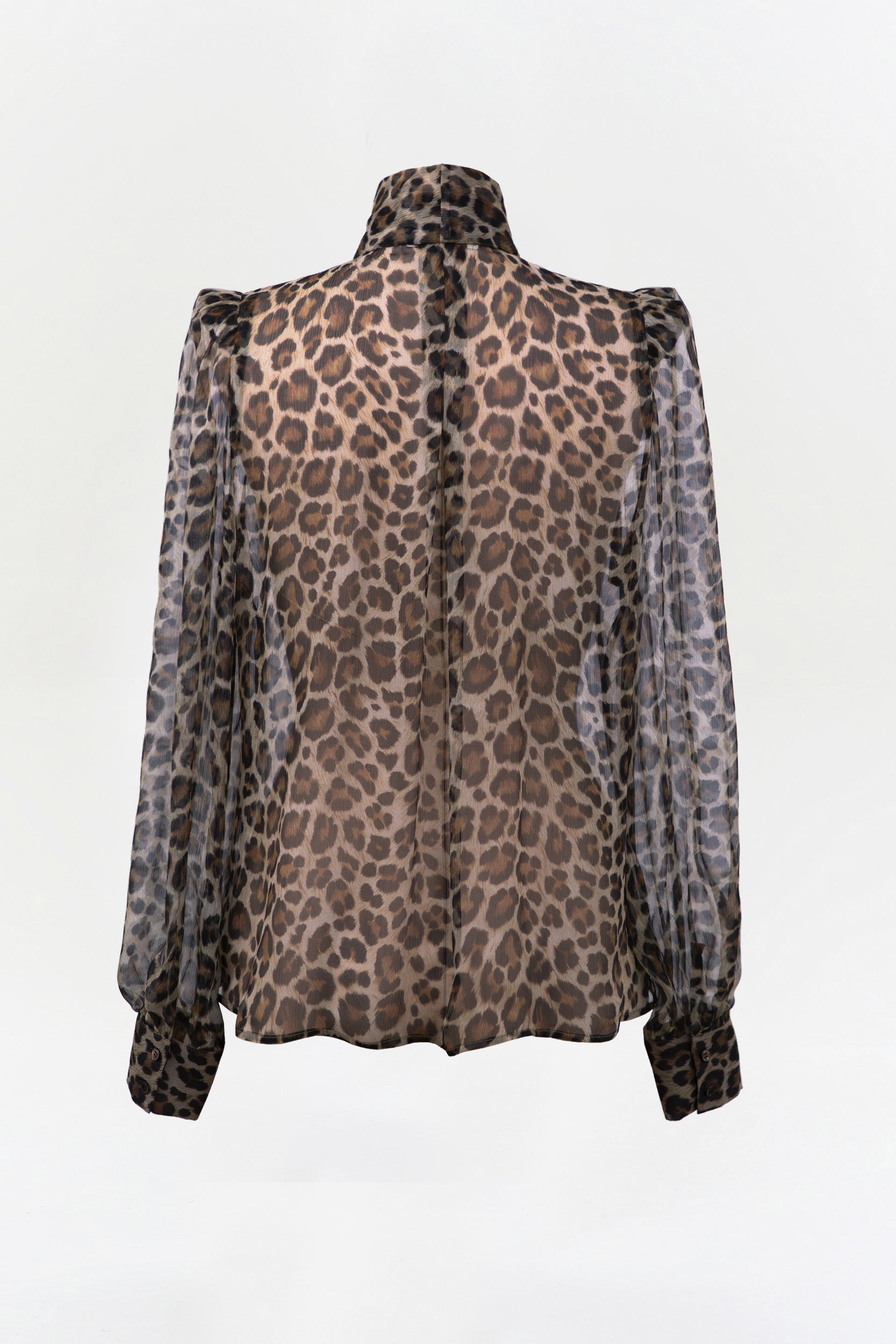 Блузка с леопардовым принтом выполнена из легкого полупрозрачного шелкового шифона. Лаконичная модель дополнена строгим воротником-стойкой с лентами, которые можно завязать в бант или изящный узел и акцентными подплечниками. Блузка застегивается на перламутровые пуговицы из ракушки.