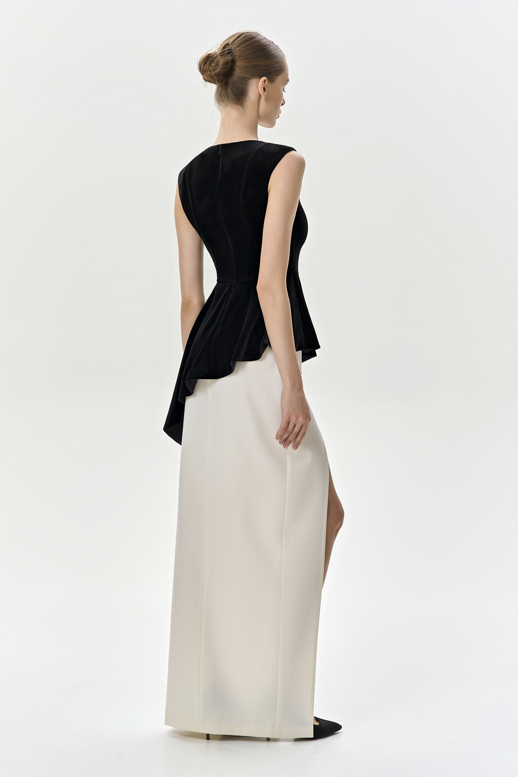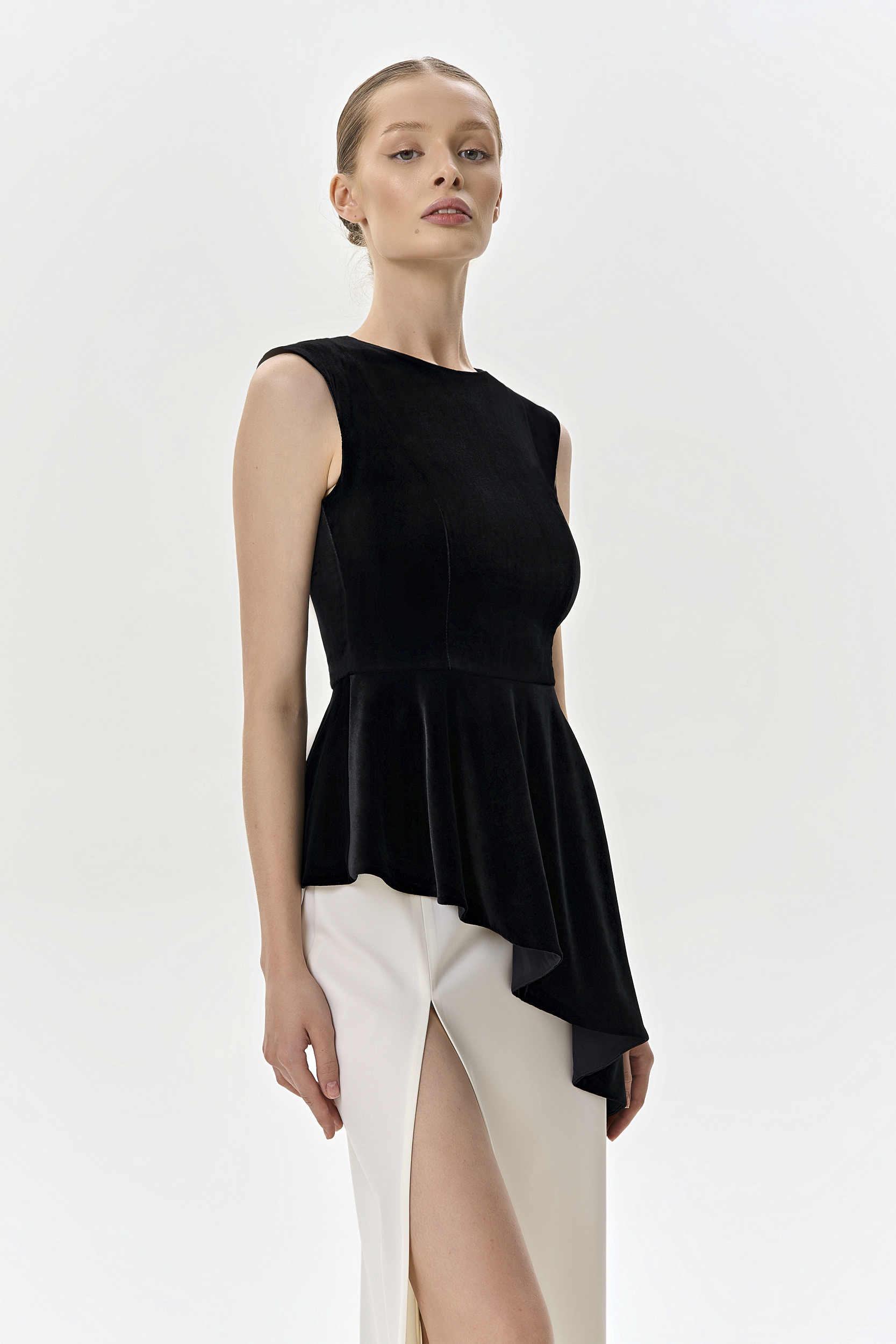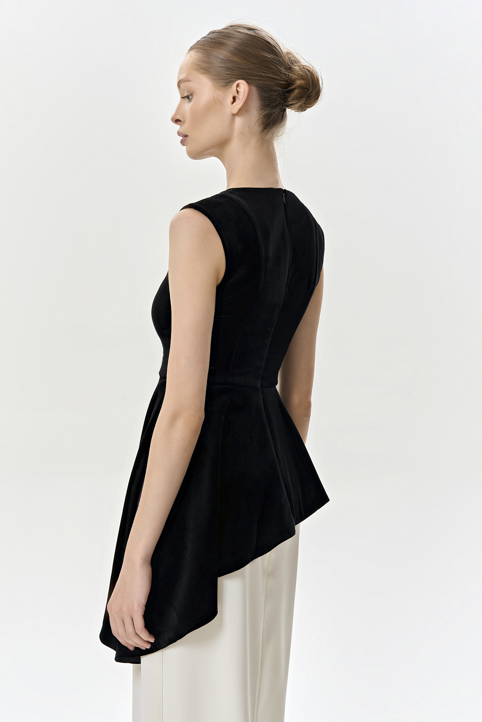 Блузка с асимметричной баской выполнена из тонкого шелкового бархата, который плавно скользит по телу, обрисовывая силуэт и формируя естественную драпировку. Отточенная до идеала геометрия линий создает безупречный силуэт с акцентом на талию. Элегантный вечерний образ в сочетании с длинной юбкой теплого белого оттенка, с высоким разрезом по ноге. Блузка на шелковой подкладке, застегивается на молнию по спинке.