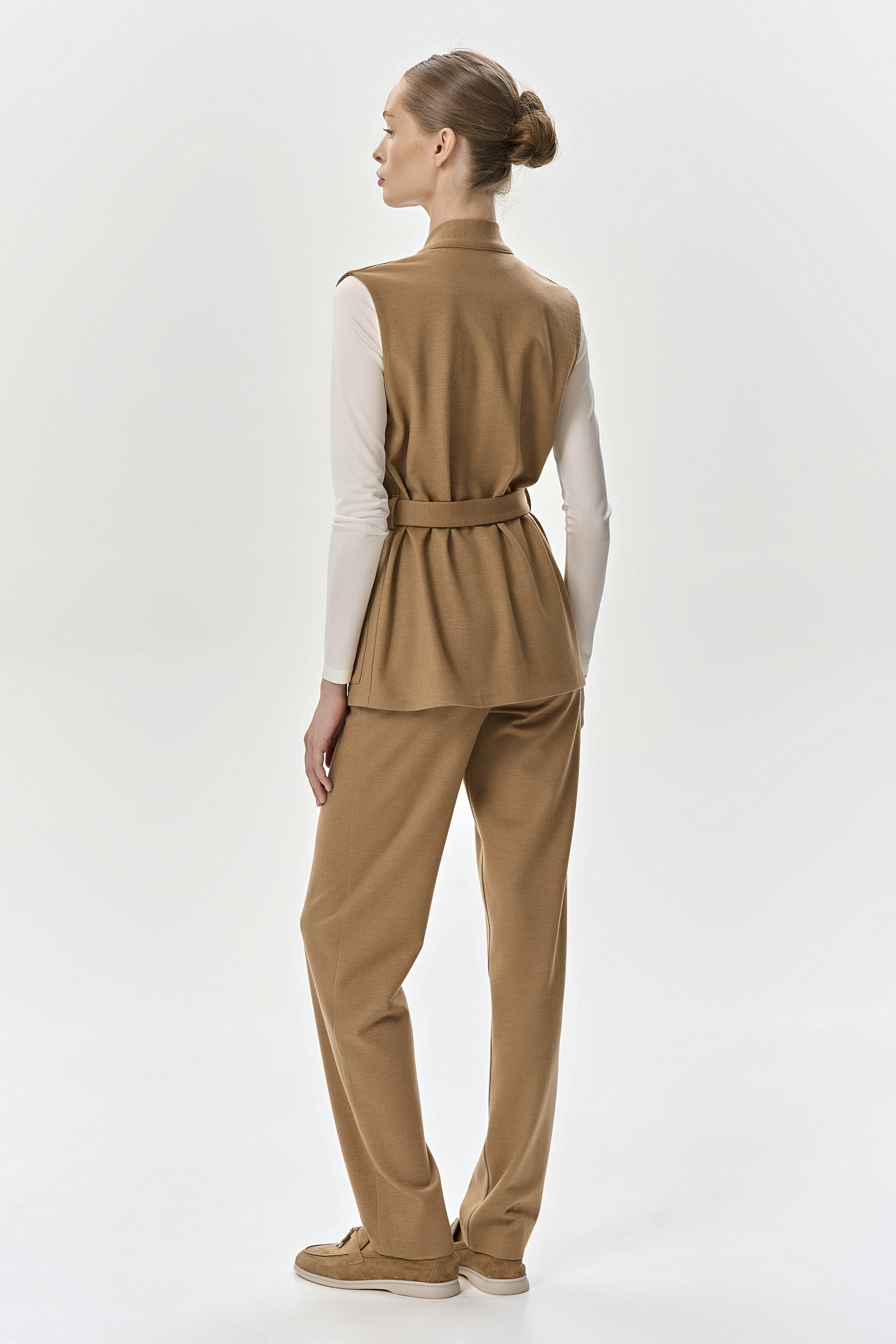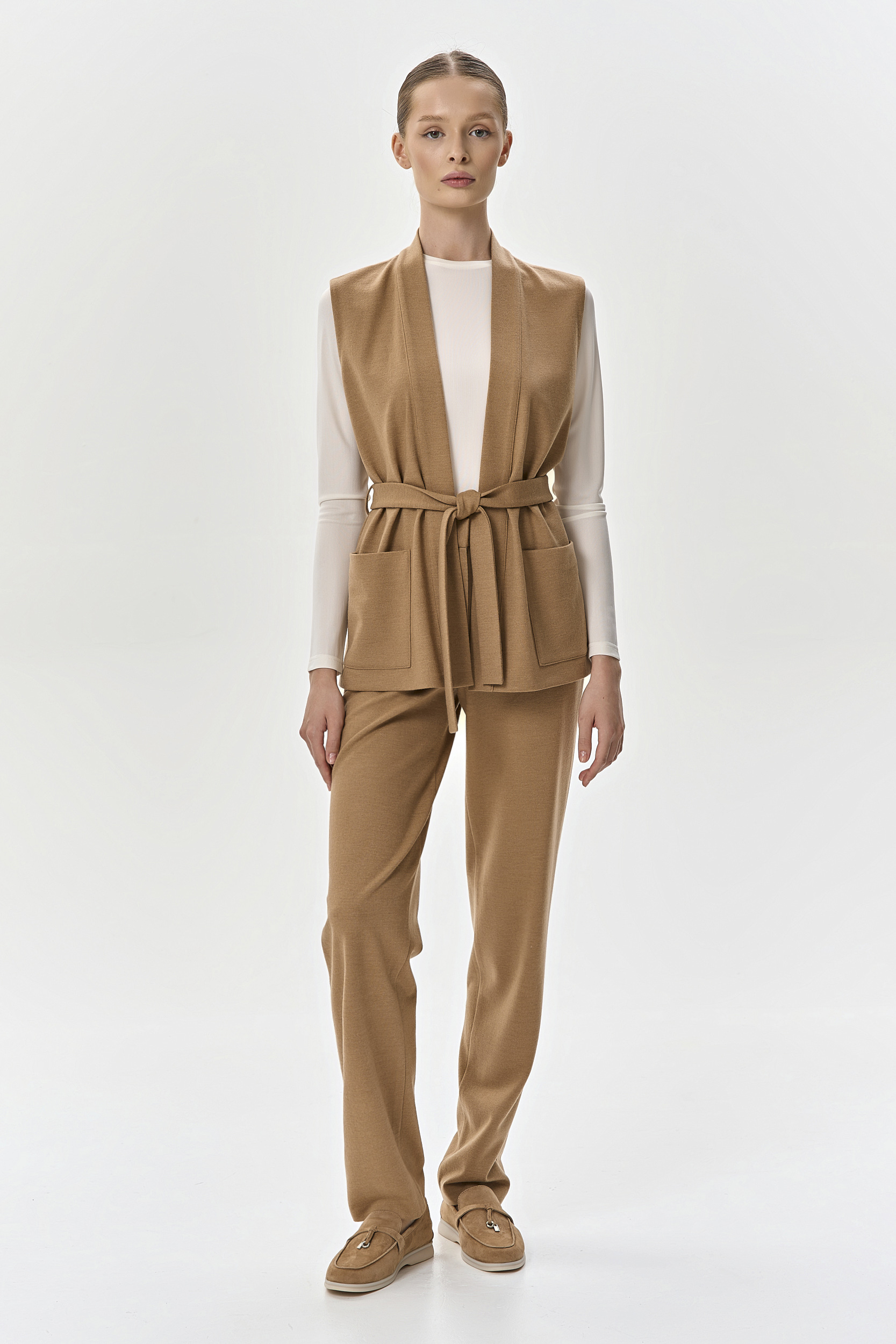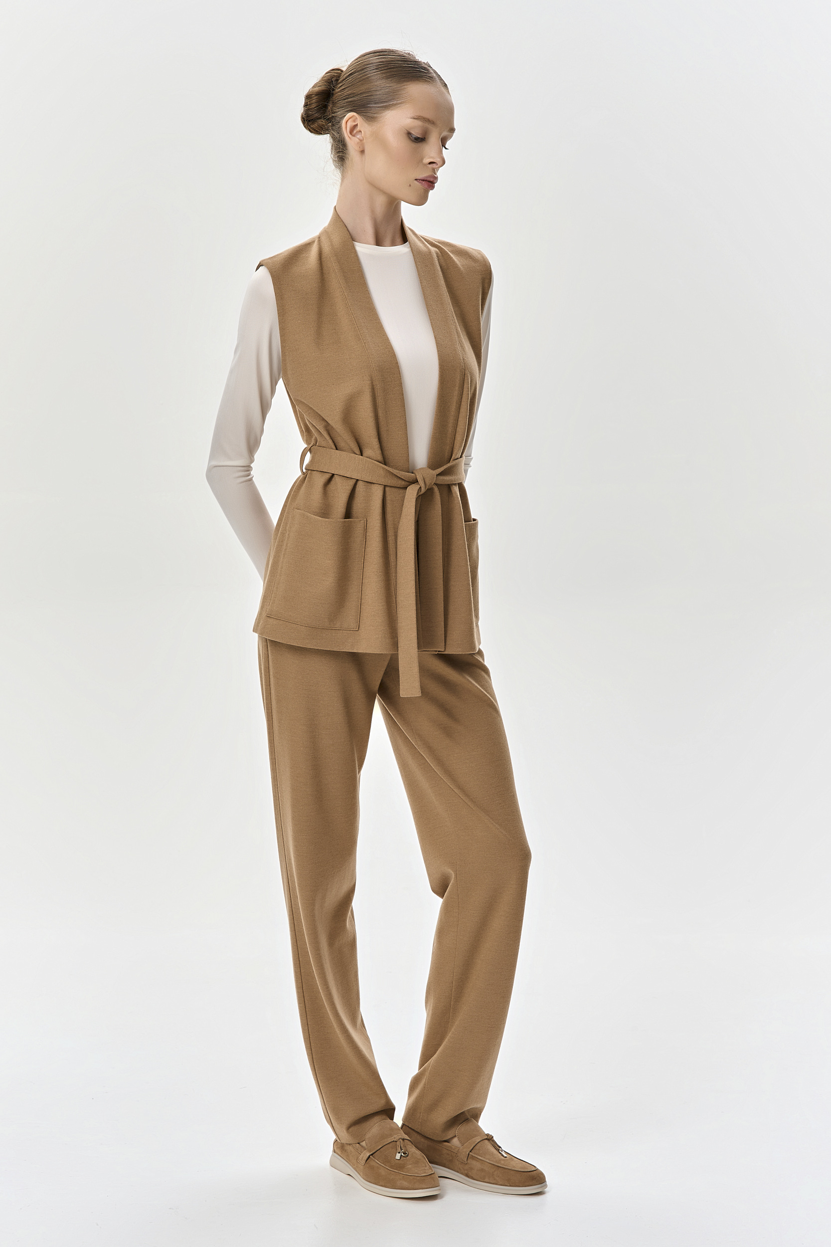 Кашемировый костюм-двойка в светло-коричневом цвете состоит из жилета с накладными карманами, длинным поясом и слегка зауженных брюк с эластичным поясом по спинке и боковыми карманами. Монохромный комплект подойдёт как для путешествий, так и для повседневных прогулок. Костюм из тонкого трикотажного кашемира имеет бархатистую поверхность, невероятно комфортный и способен стать незаменимым в путешествиях.