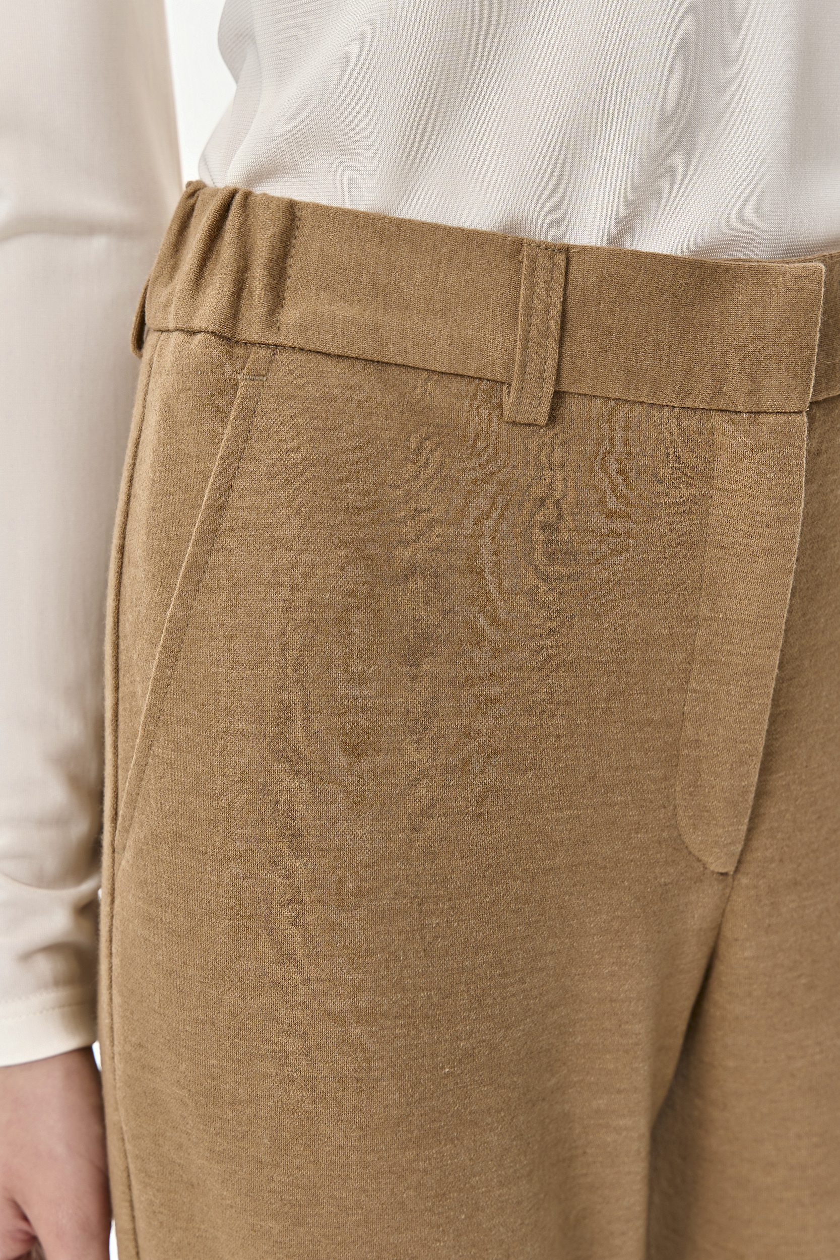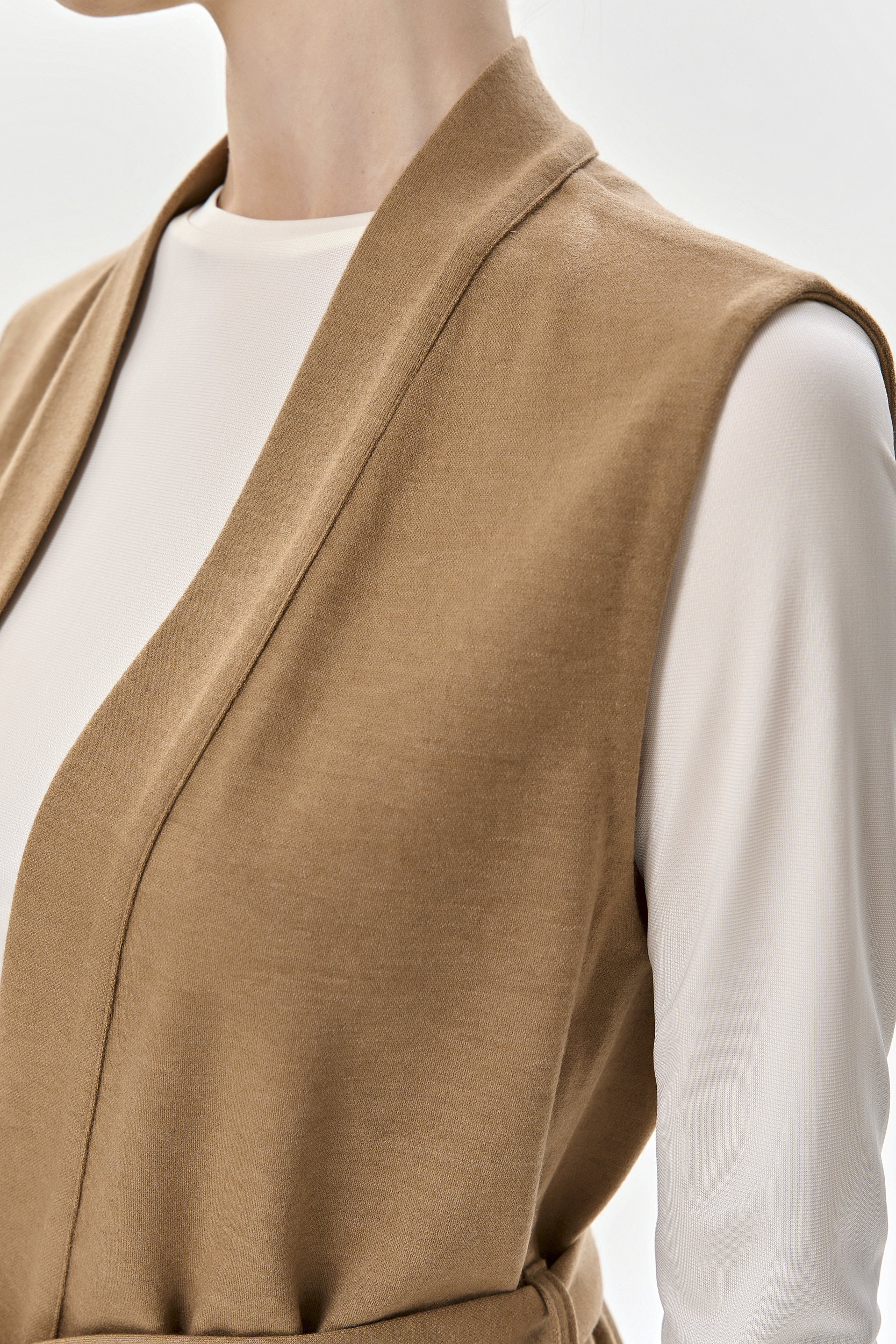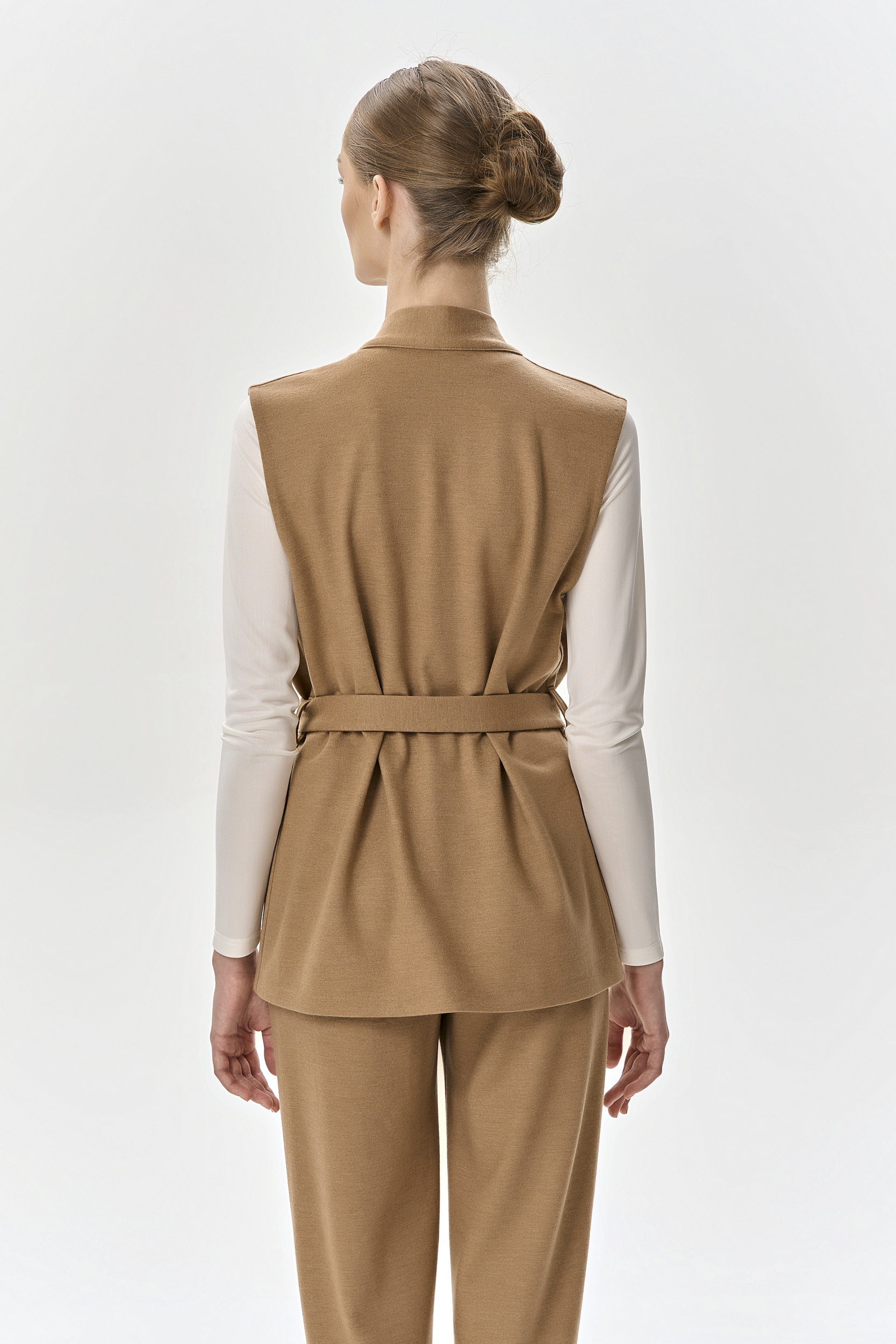Кашемировый костюм-двойка в светло-коричневом цвете состоит из жилета с накладными карманами, длинным поясом и слегка зауженных брюк с эластичным поясом по спинке и боковыми карманами. Монохромный комплект подойдёт как для путешествий, так и для повседневных прогулок. Костюм из тонкого трикотажного кашемира имеет бархатистую поверхность, невероятно комфортный и способен стать незаменимым в путешествиях.