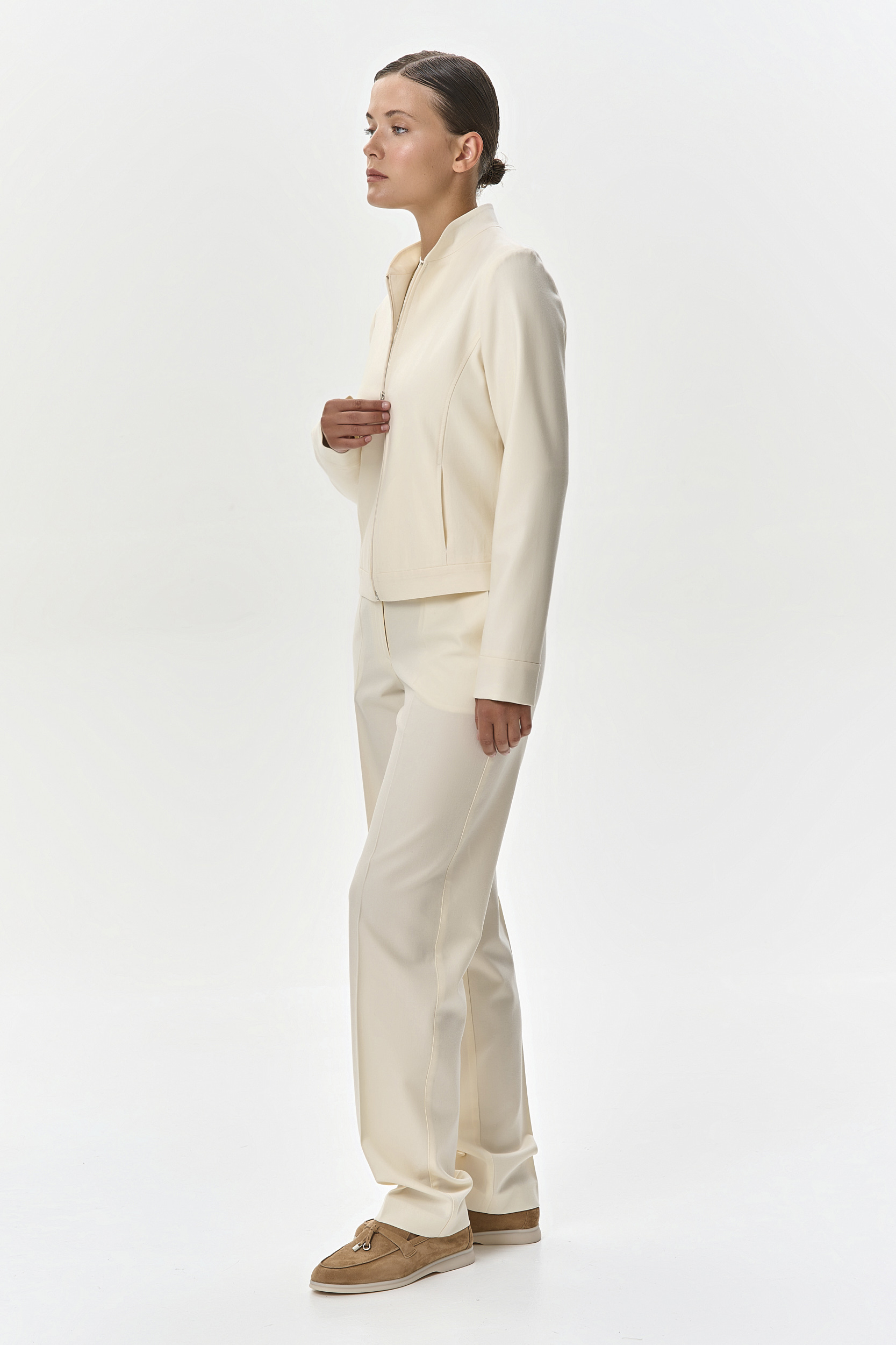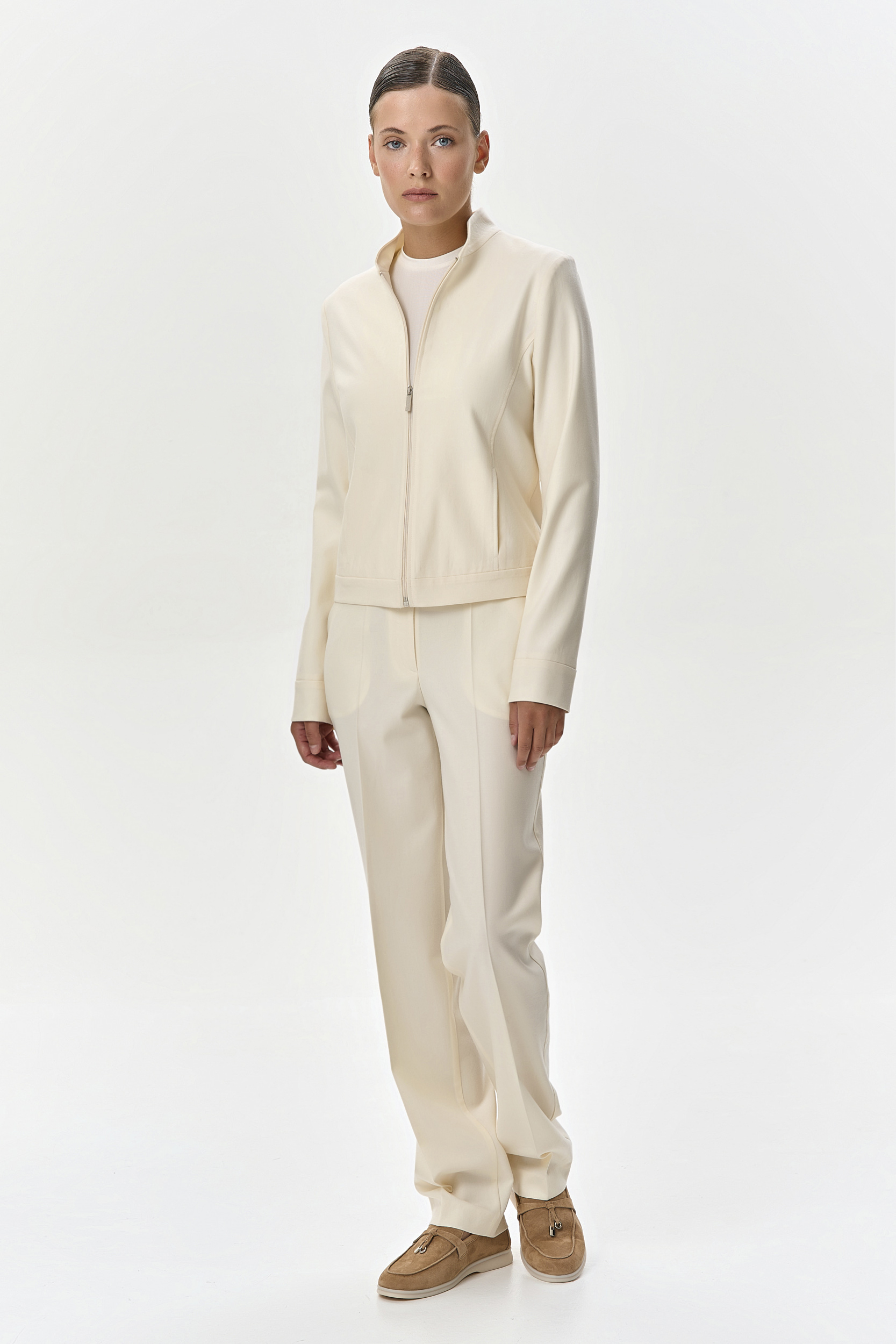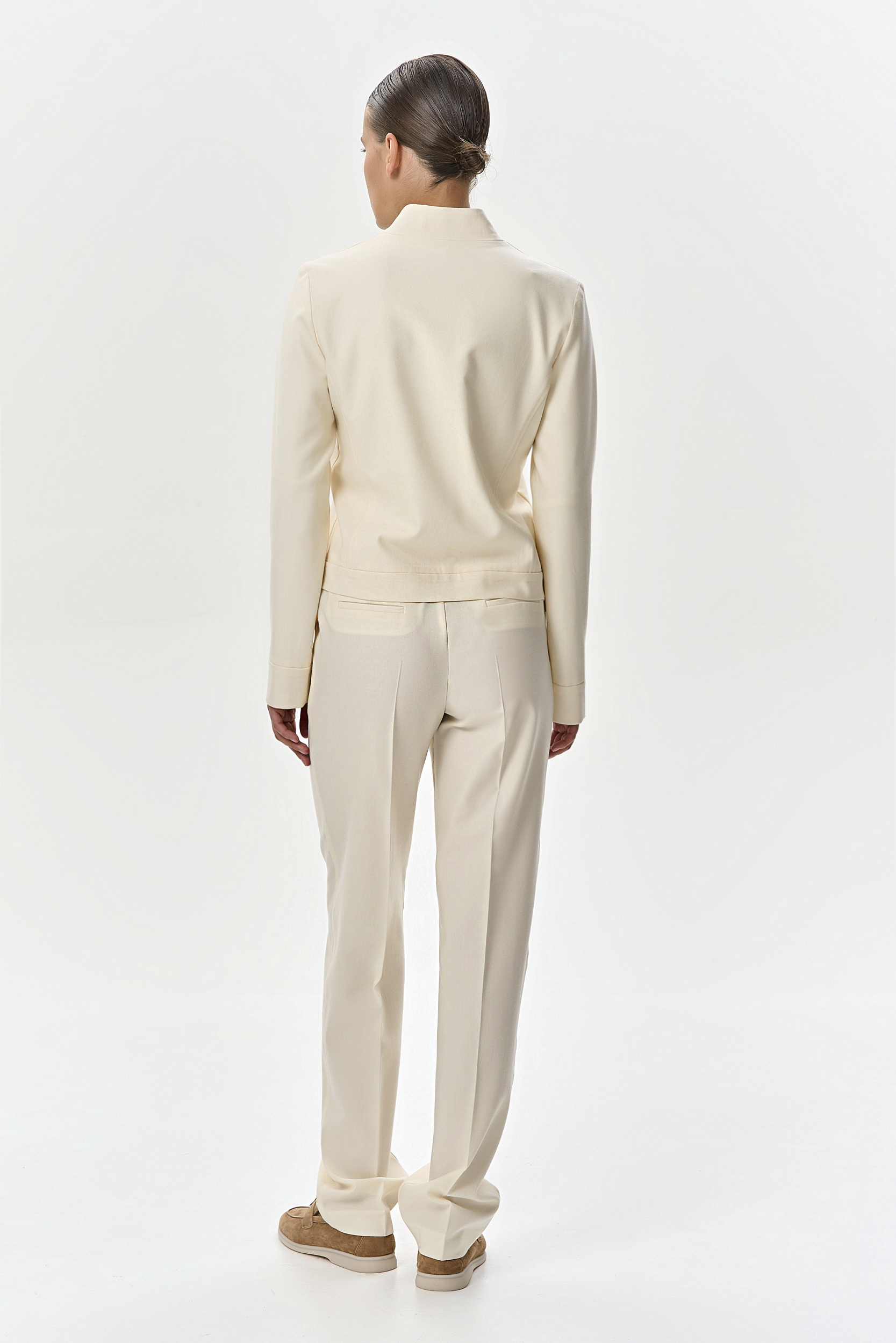 Кашемировый костюм-двойка деликатного молочного цвета состоит из укороченного жакета на молнии, с воротником-стойкой на шелковой подкладке и брюк с боковыми карманами. Брюки имеют эластичный пояс со спинки и вытачки, что обеспечивает идеальную и комфортную посадку в талии и бедрах. Комплект выглядит свежо и позволит комфортно провести время в поездке, за счет удобного кроя и нежной телу ткани.