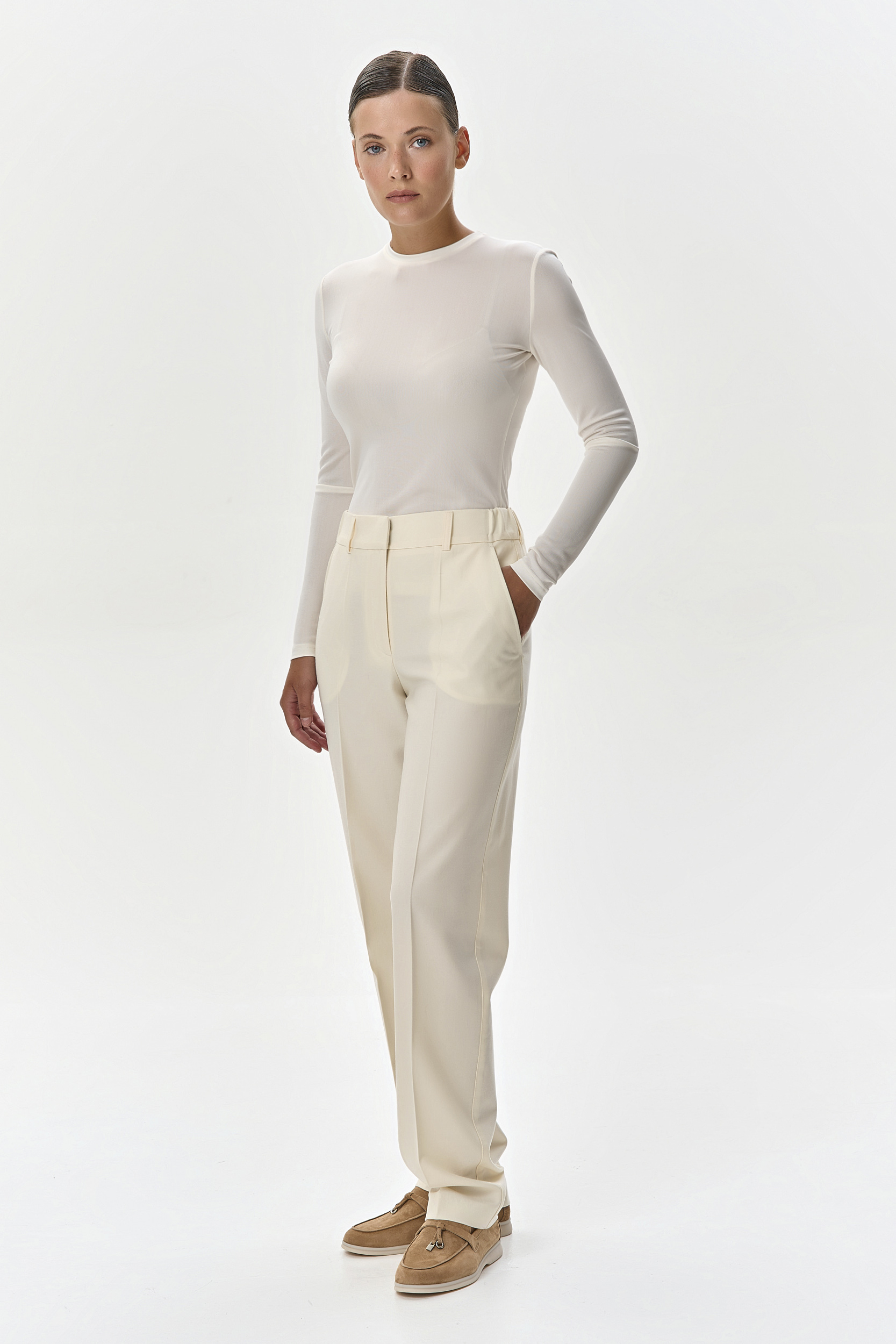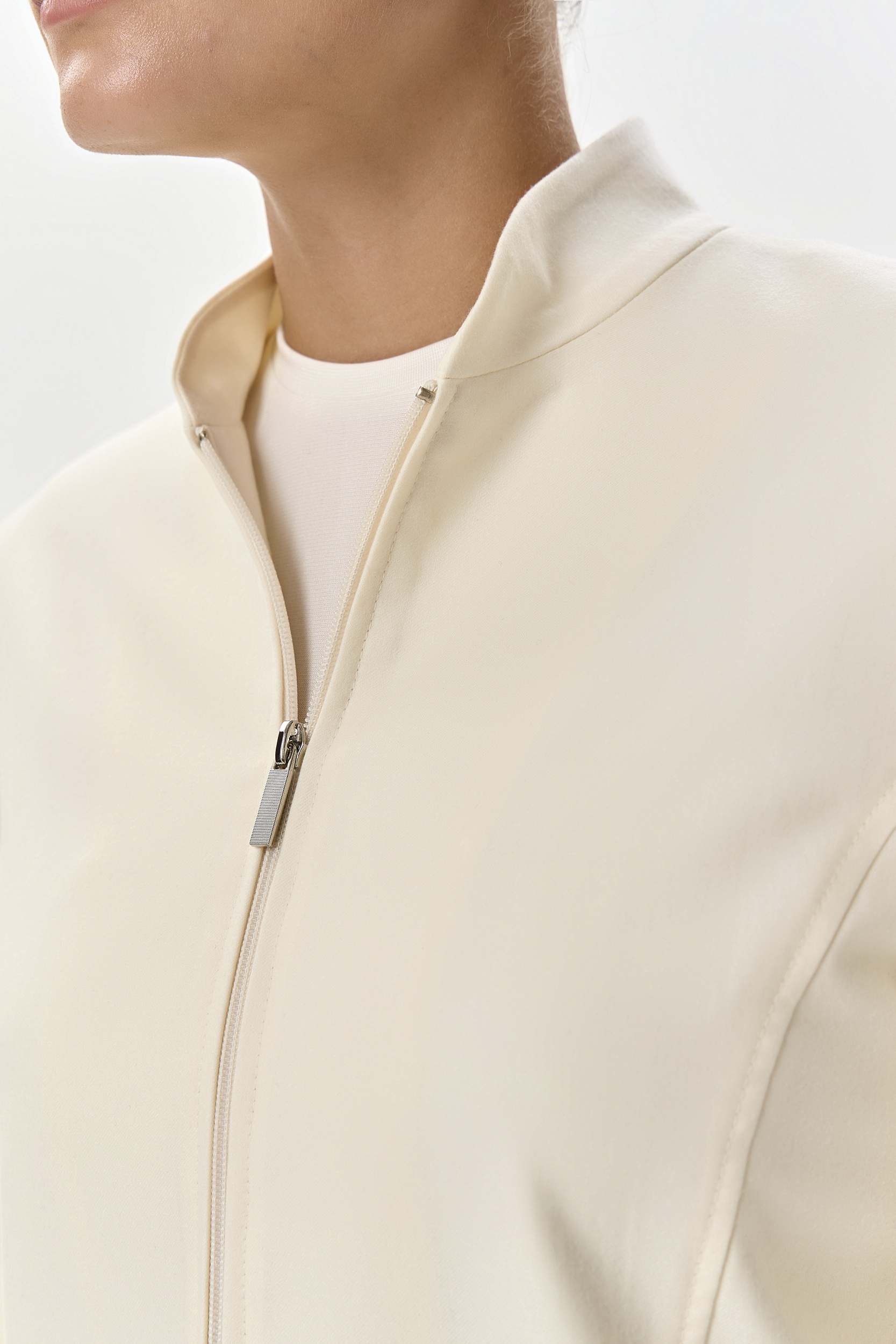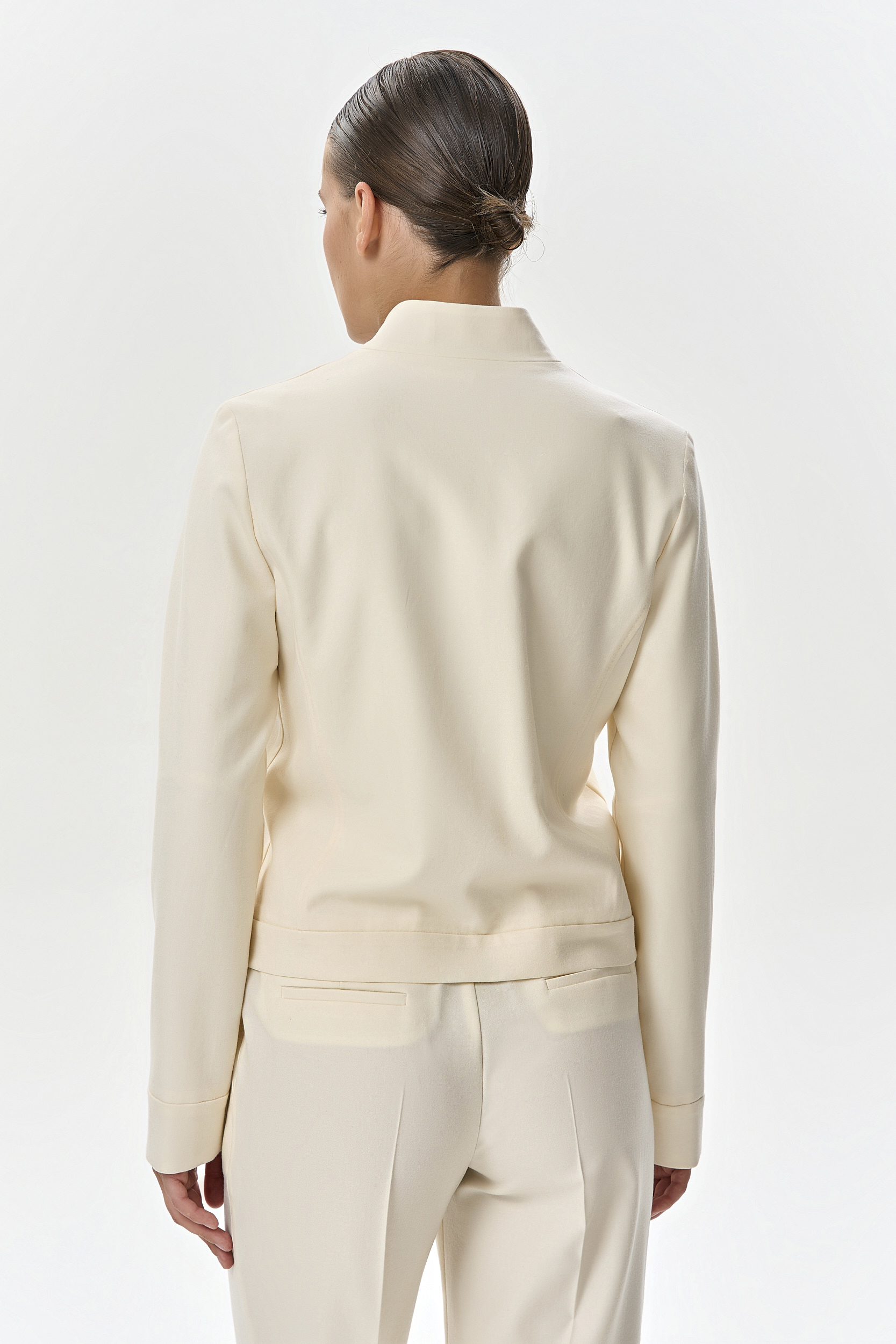 Кашемировый костюм-двойка деликатного молочного цвета состоит из укороченного жакета на молнии, с воротником-стойкой на шелковой подкладке и брюк с боковыми карманами. Брюки имеют эластичный пояс со спинки и вытачки, что обеспечивает идеальную и комфортную посадку в талии и бедрах. Комплект выглядит свежо и позволит комфортно провести время в поездке, за счет удобного кроя и нежной телу ткани.