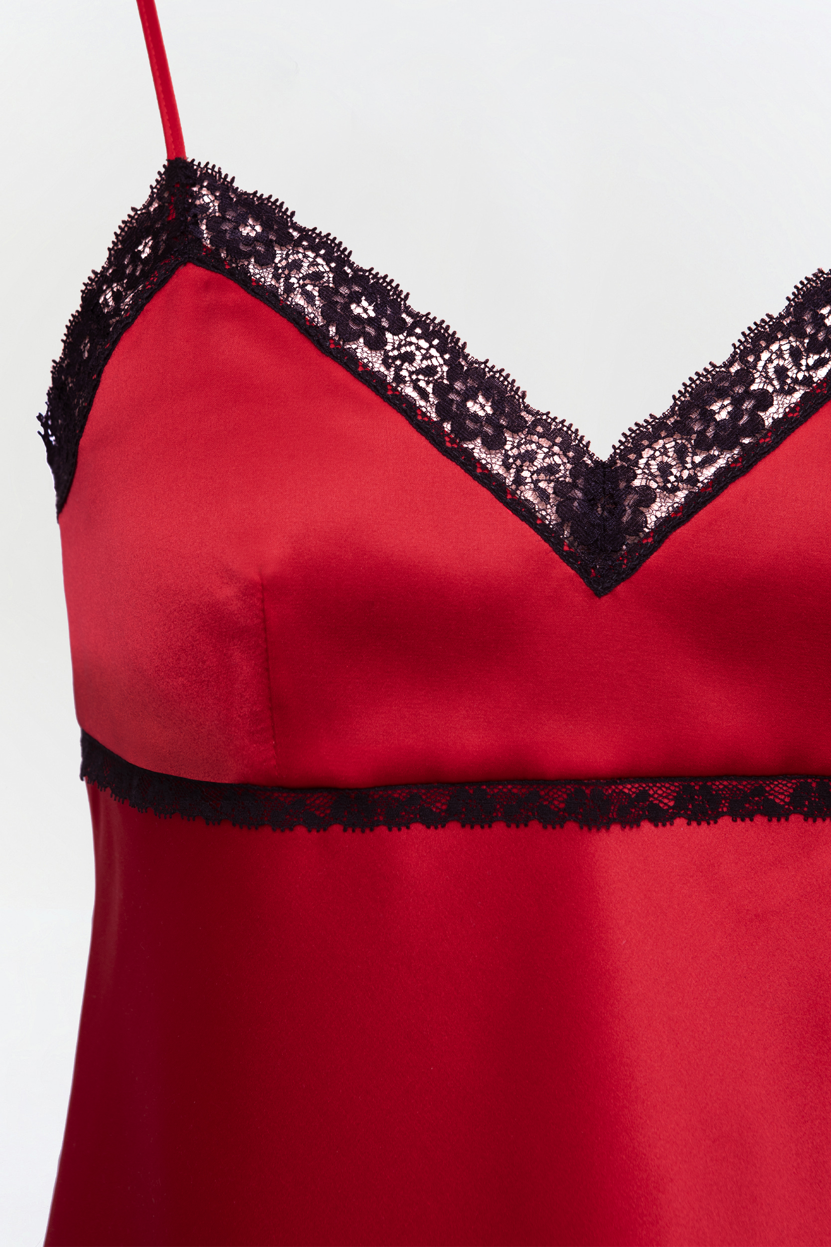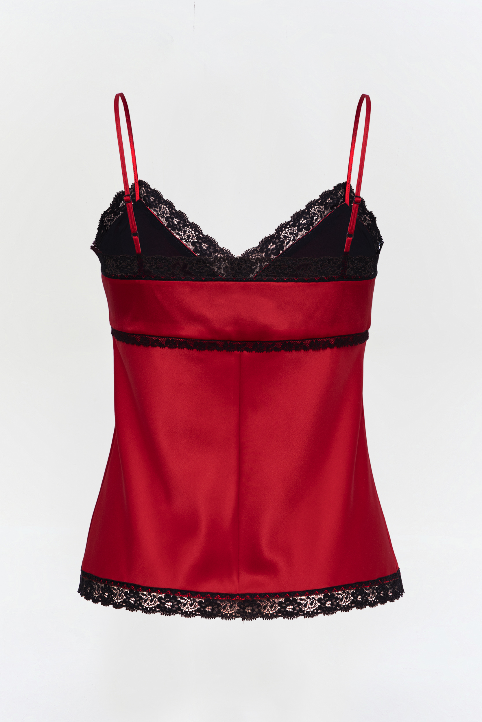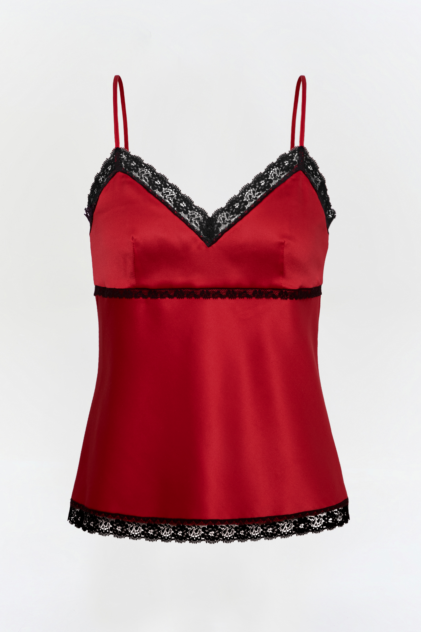 Топ в бельевом стиле является необходимым элементом базового гардероба, который никогда не выйдет из моды. Красный оттенок атласного шелка выглядит особенно эффектно в сочетании с полупрозрачным французским кружевом черного цвета.