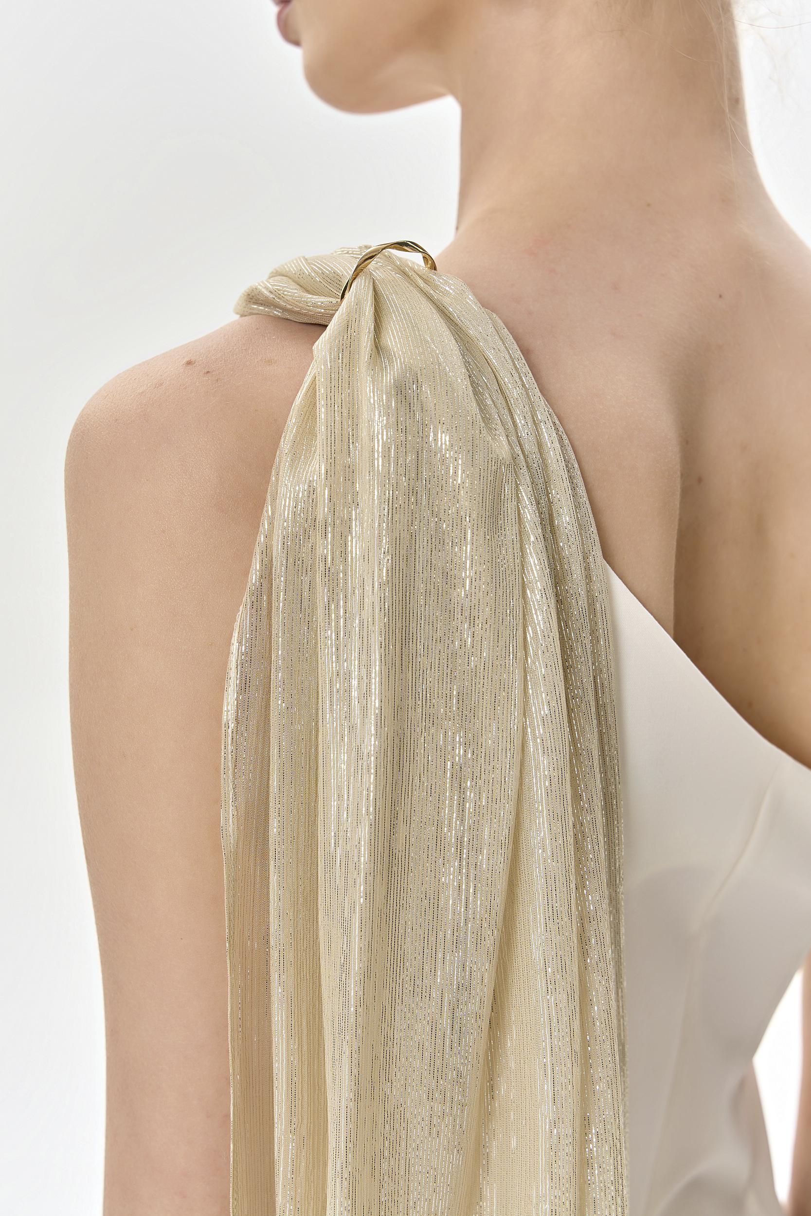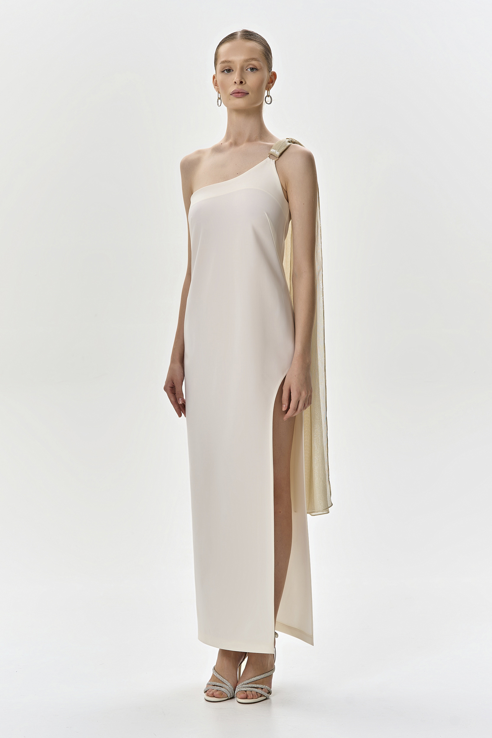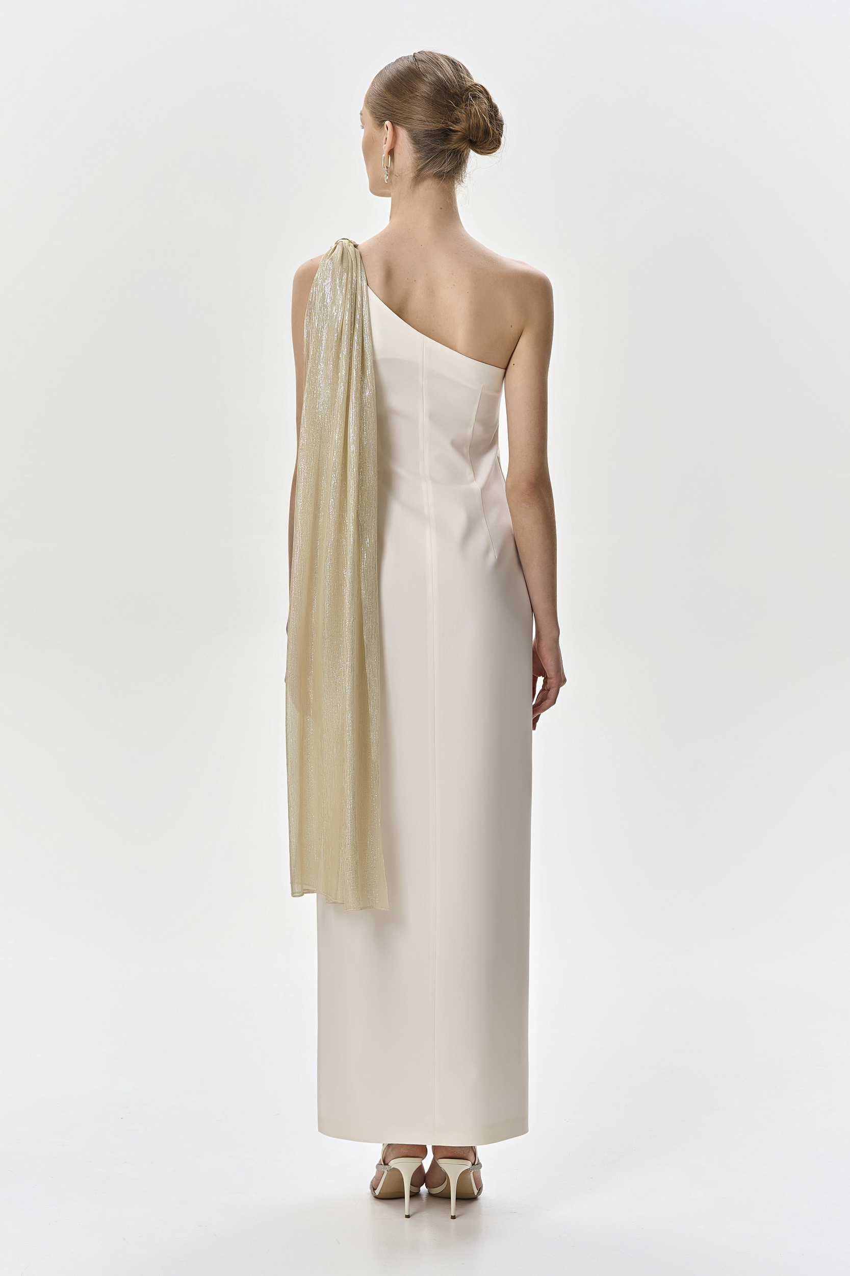 Элегантное платье-макси на одно плечо с высоким вырезом по ноге. Лямка из воздушного шелкового шифона плавно переходит в шлейф и регулируется кольцом, благодаря которому шлейф можно закрепить со стороны спинки, а можно накинуть на одно плечо. Платье создает летящий образ при ходьбе, а легкое мерцание шелка сделает ваш образ незабываемым.