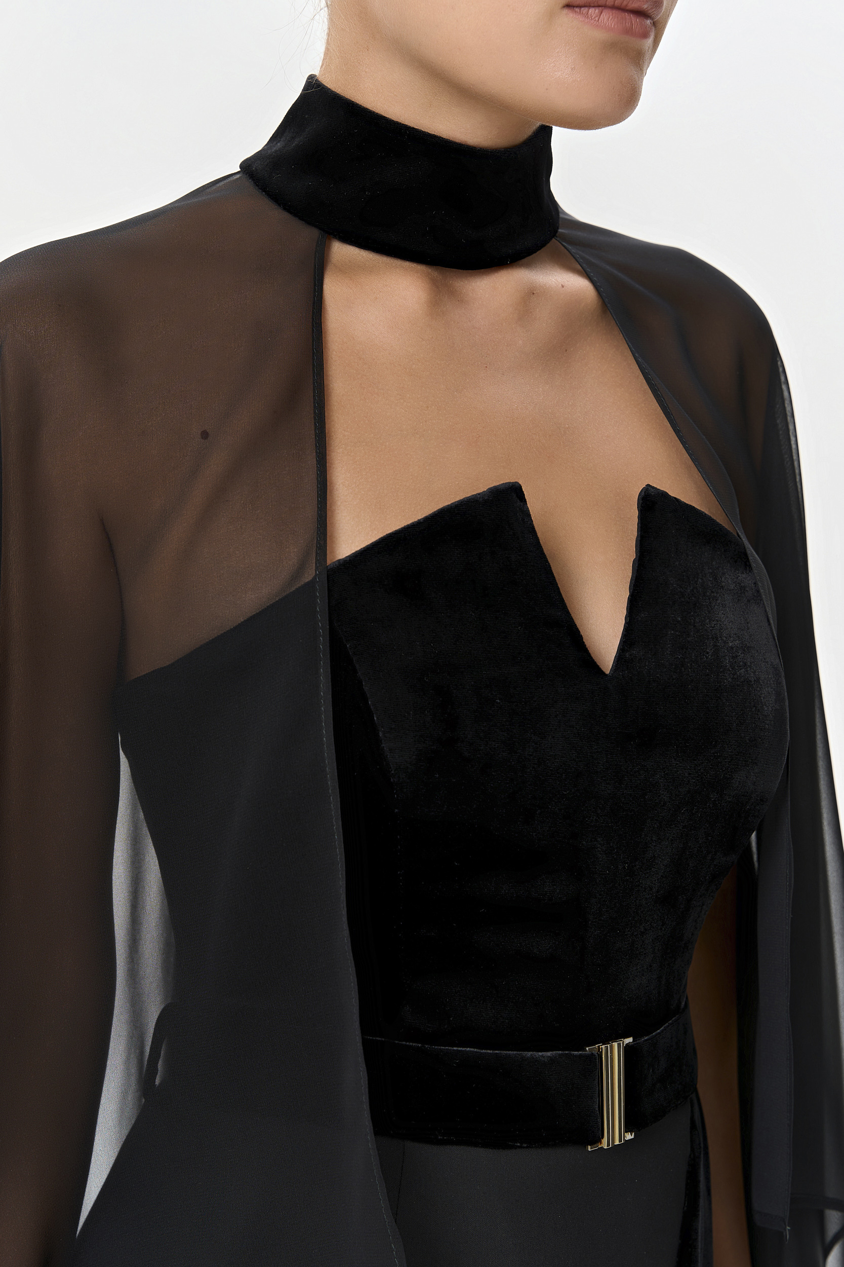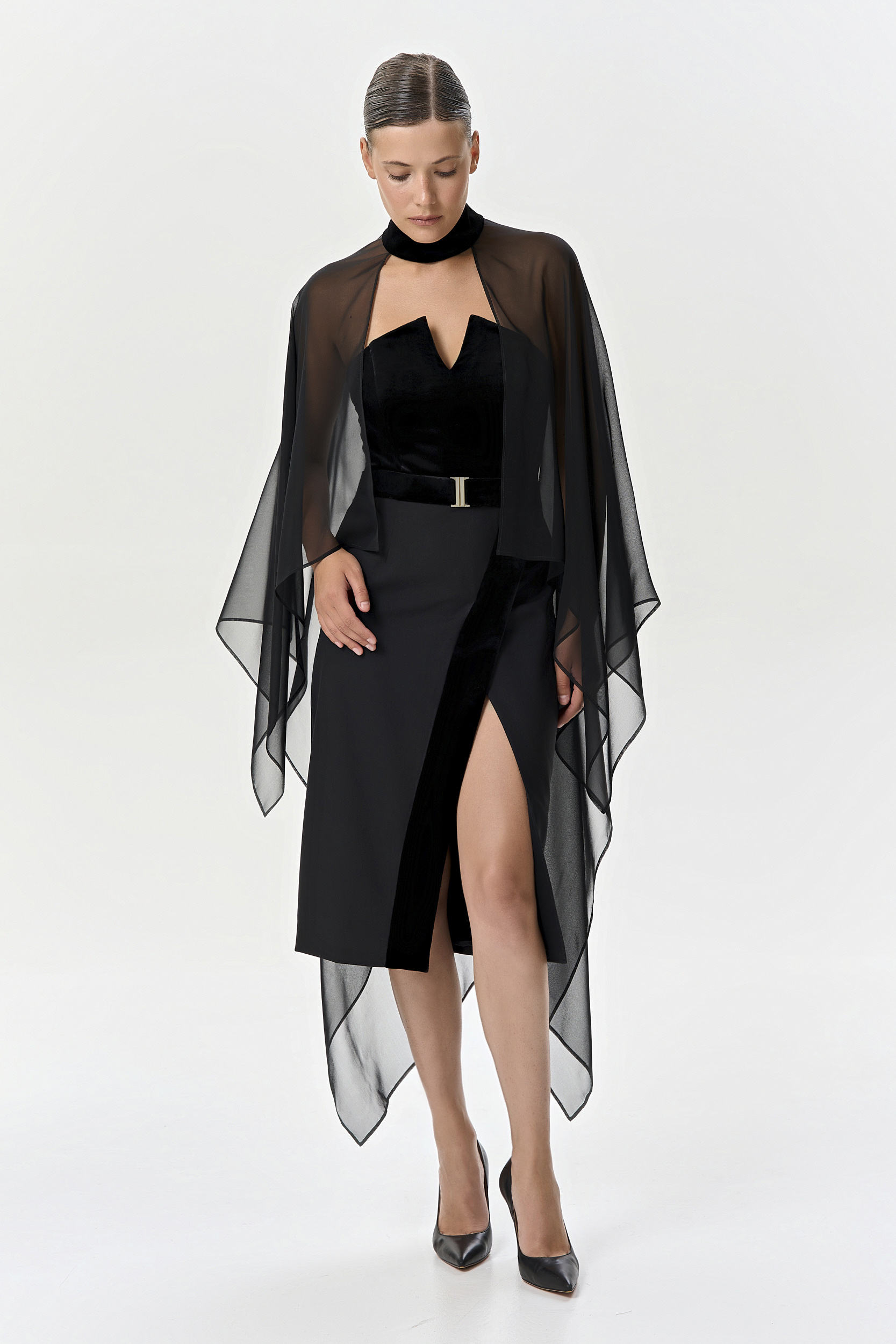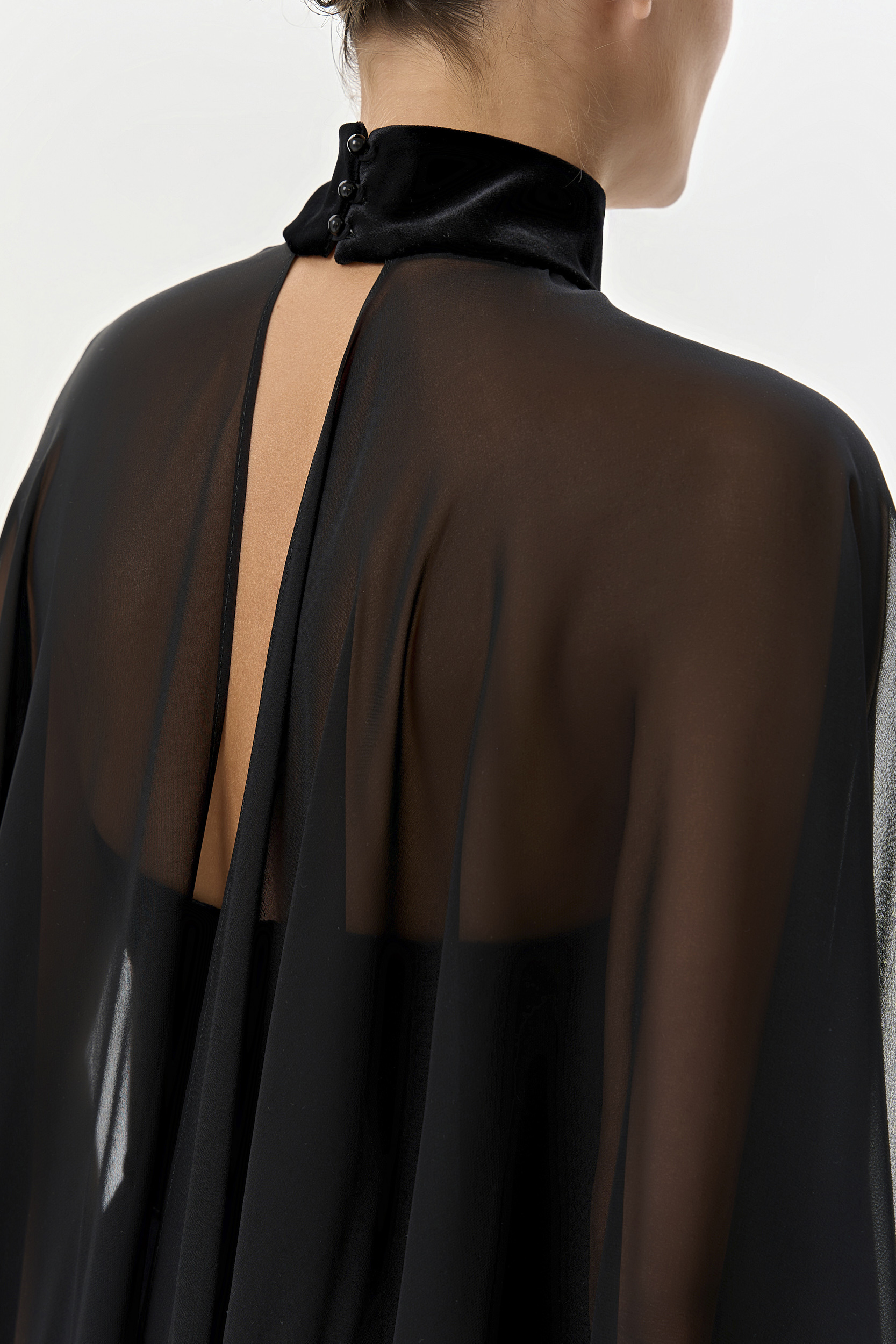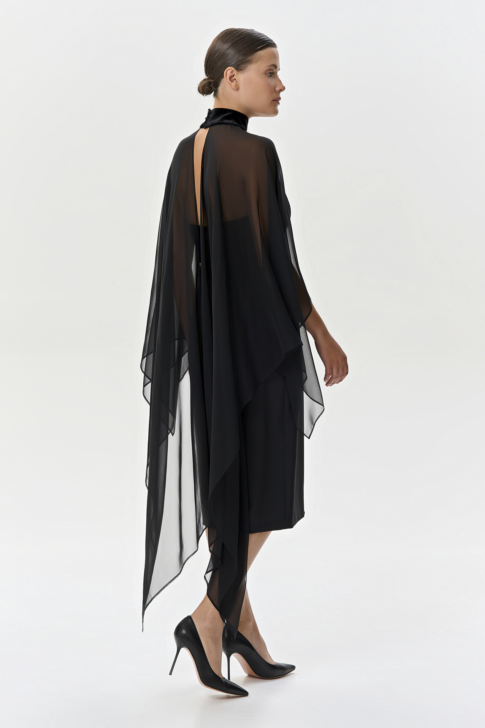 Накидка из черного шелкового шифона и воротником-стойкой из бархата внесет в ваш вечерний образ элегантный символ утонченности и статуса.