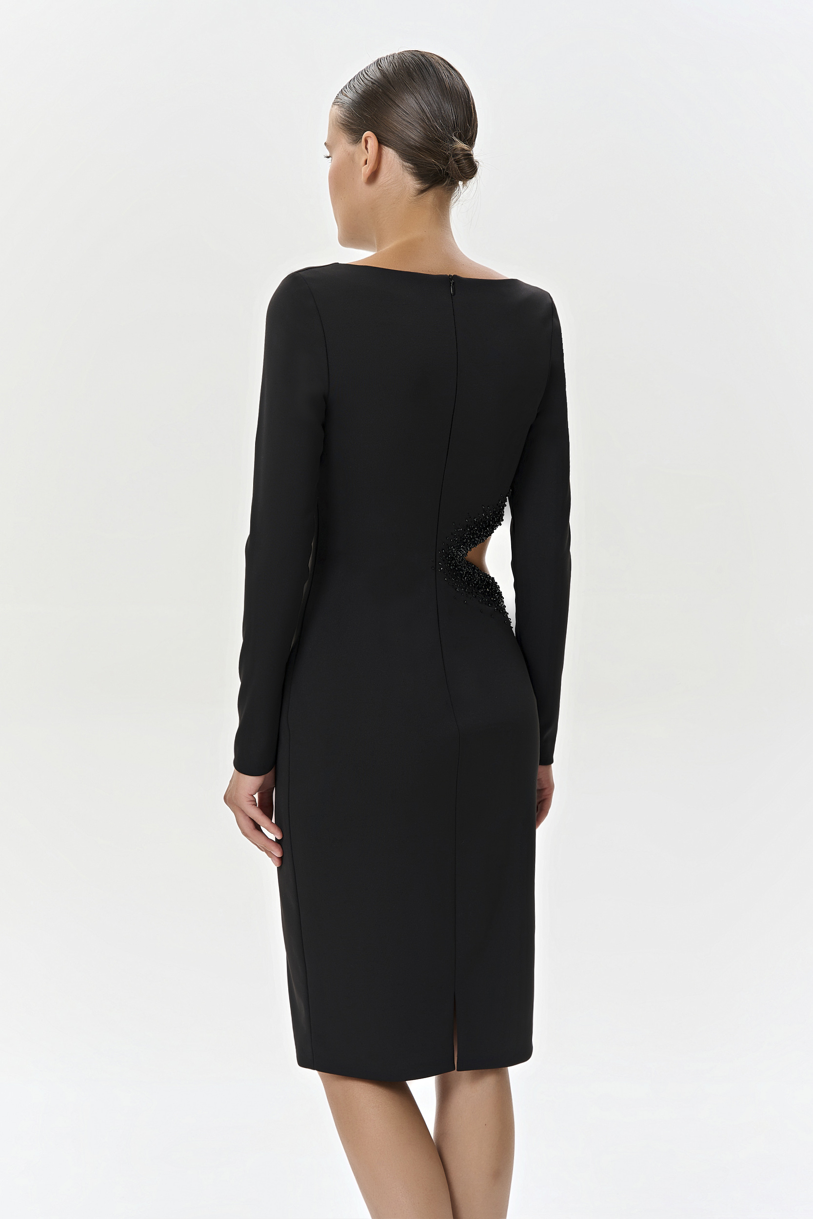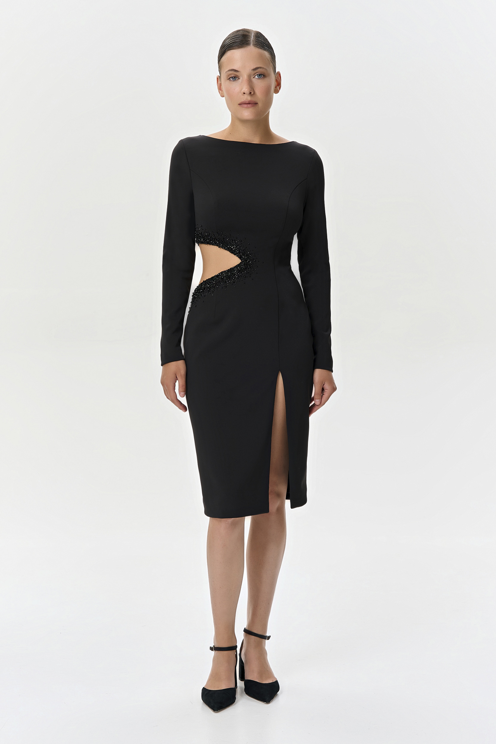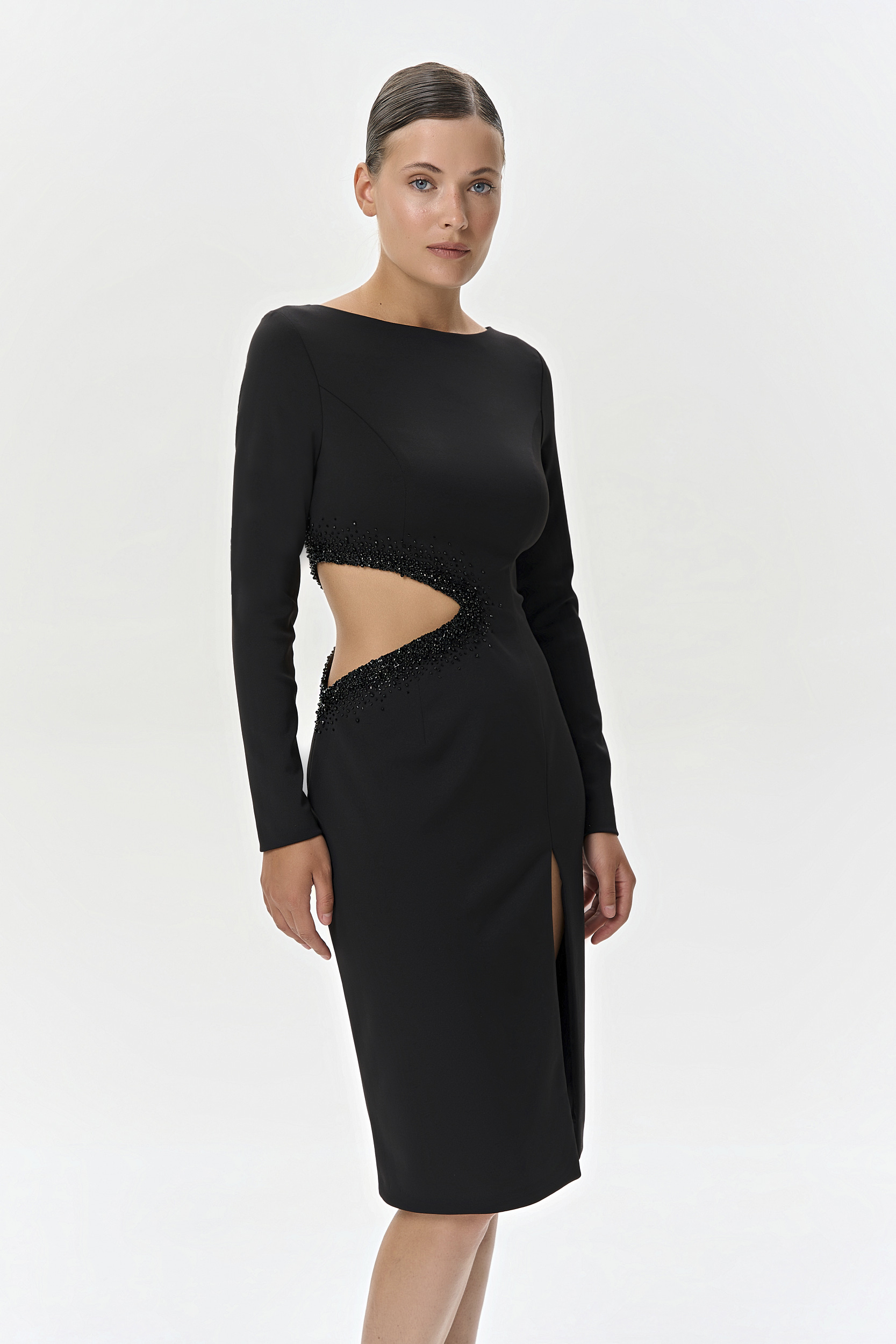 Облегающее трикотажное платье создает эффектный и в меру провокационный образ за счет выреза на талии, который вручную расшили хрустальными бусинами и бисером, на создание декора мастеру Leuverdad потребовалось 47 часов. В этом платье вам будет комфортно на протяжении всего вечера, за счет эластичности ткани и нежной шелковой подкладке. Платье имеет потайную молнию на спинке.