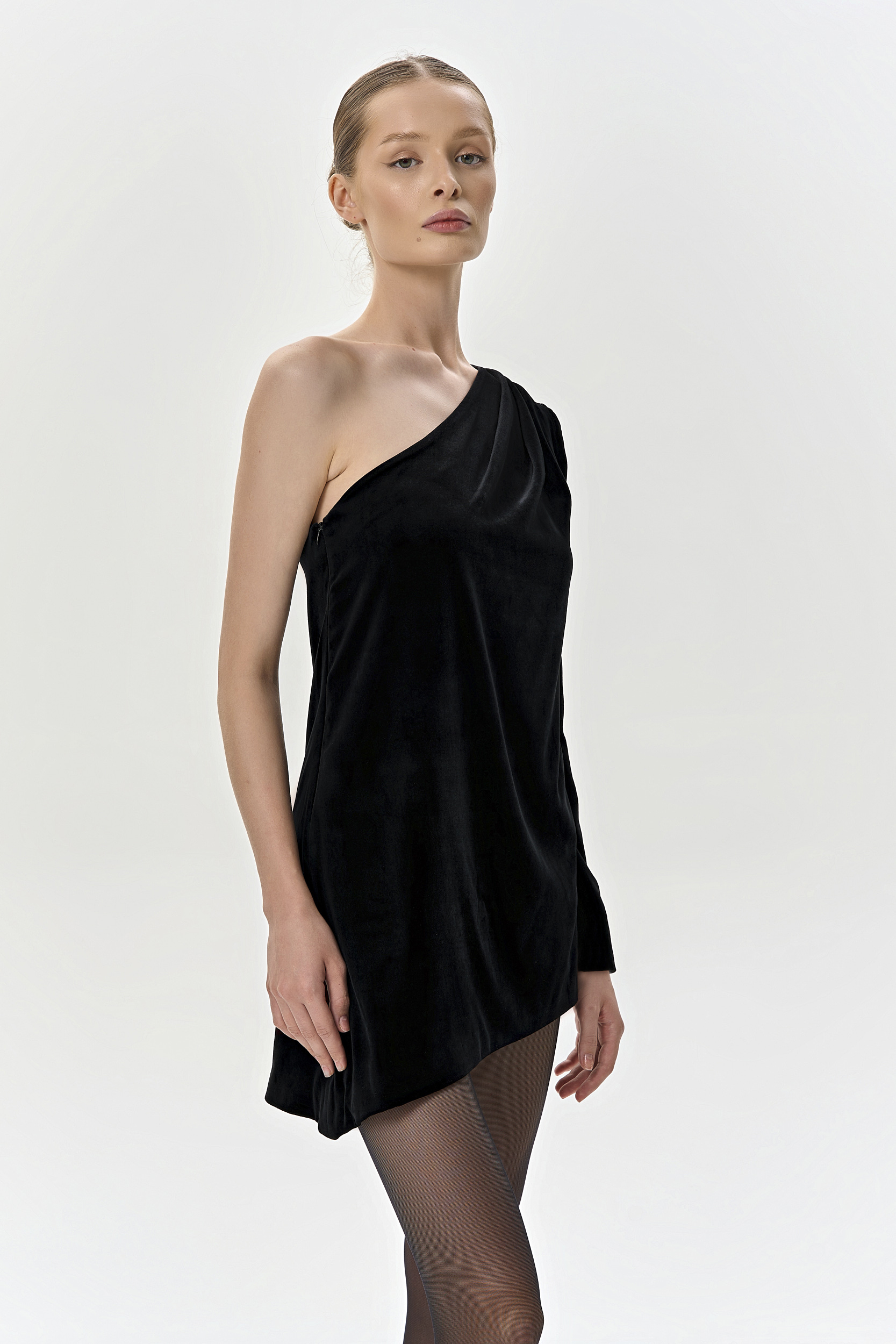 Платье-мини из шелкового бархата гарантирует эффектный образ. Модель дополнена изящными складками на плече, которые создают светлые блики и усиливают глубину черного цвета бархата. Платье на шелковой подкладке обеспечивает самое нежное прикосновение к вашему телу.