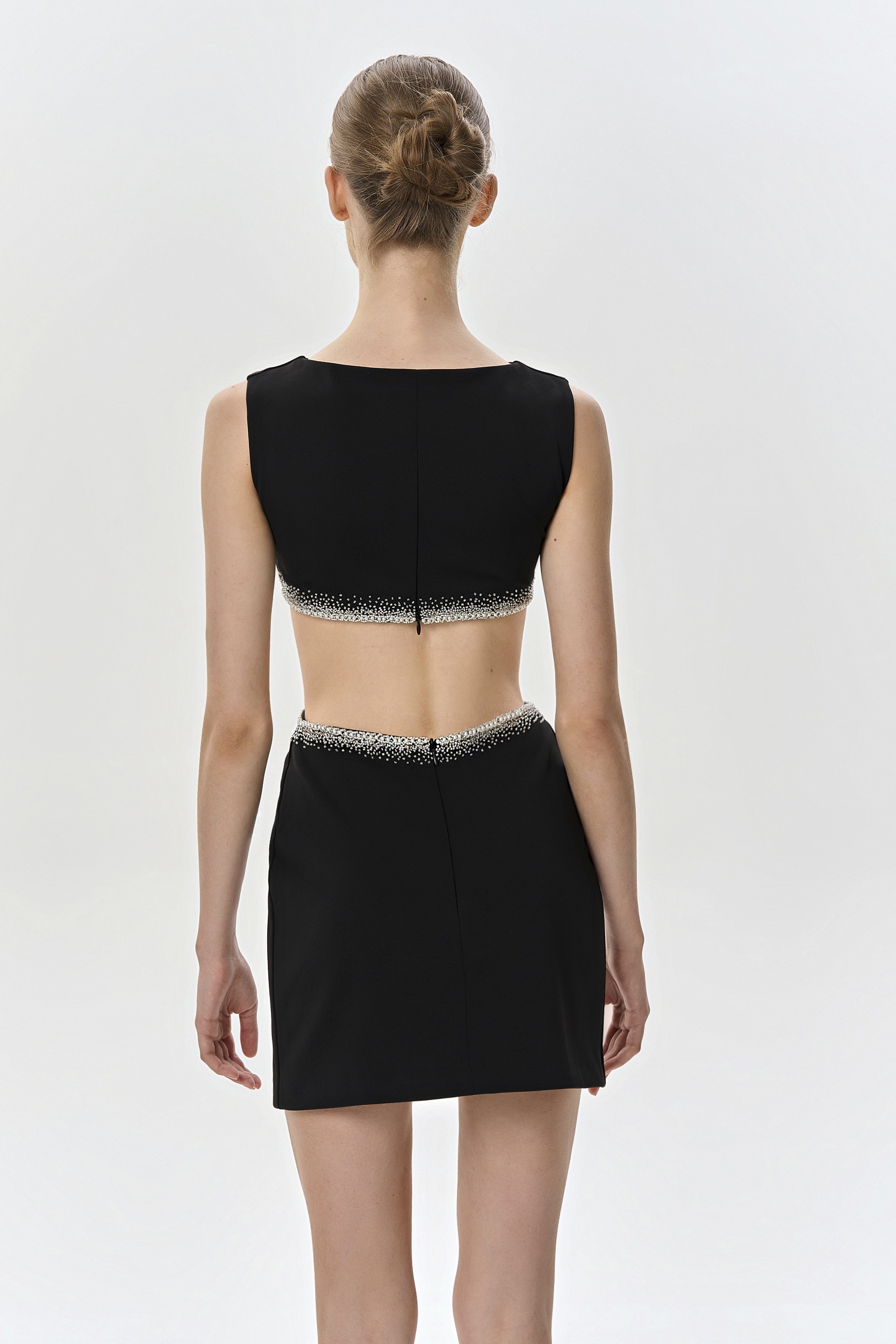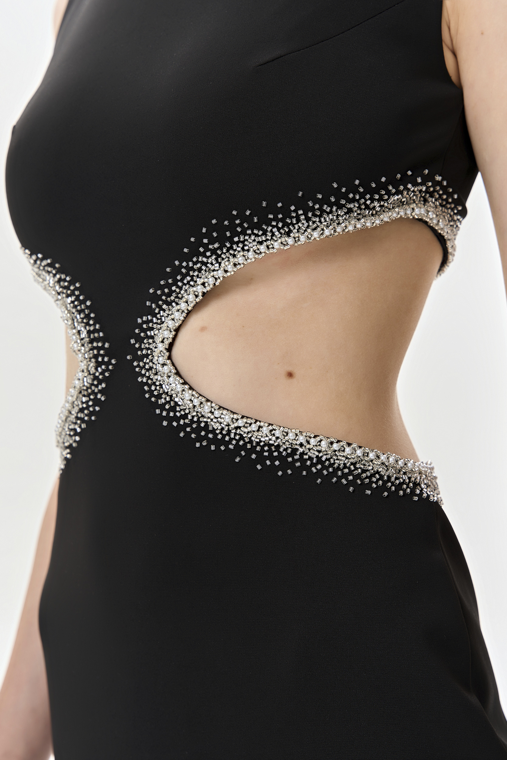 Черное платье-мини выполнено из плательного трикотажа на шелковой подкладке, с вырезами на талии. Модель вручную расшита переливающимся бисером и бусинами. Платье застегивается на две потайные молнии со спинки. Процесс изготовления занял у мастеров Leuverdad 62 часа ручной работы.