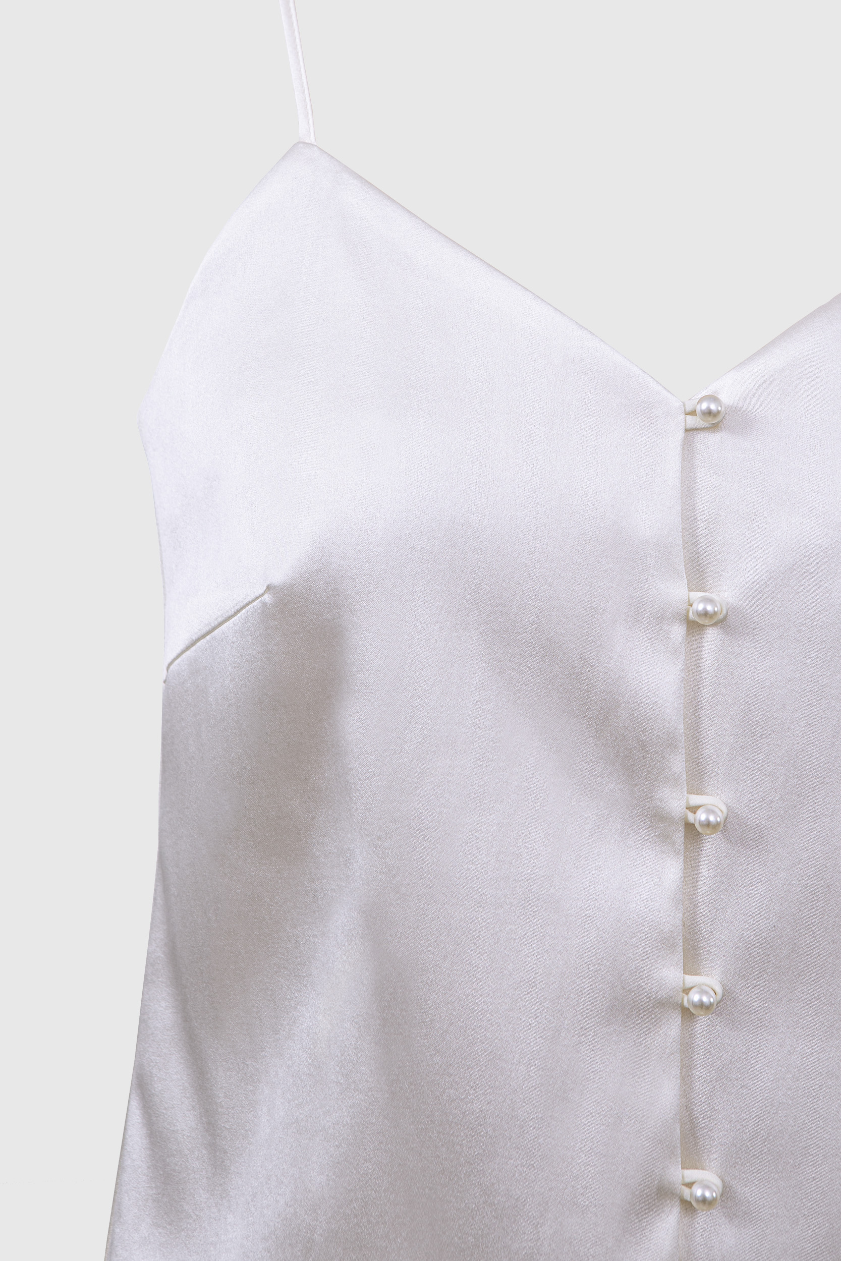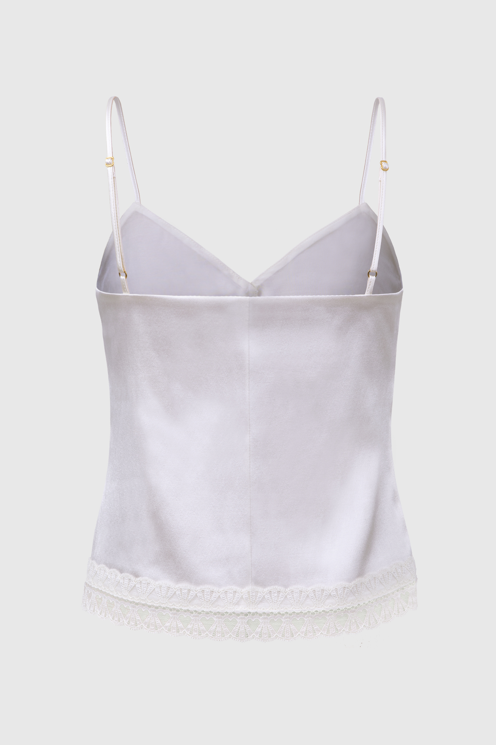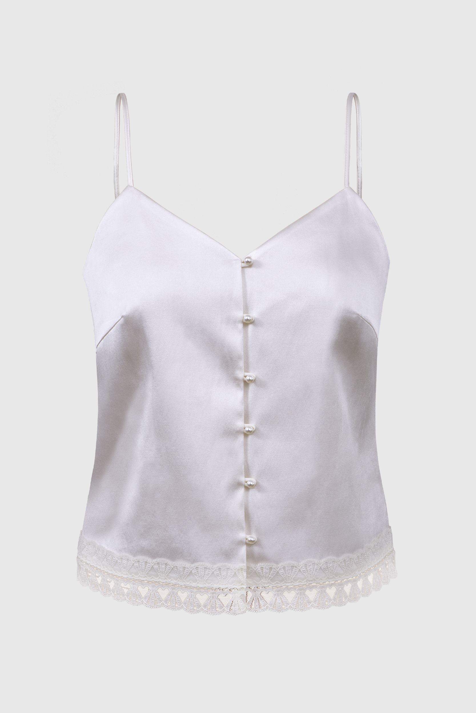 Топ свободного кроя на тонких бретелях выполнен из шелковой ткани, на тонкой подкладке. Сливочный оттенок и отделка французским кружевом добавит нежности образам. Топ застегивается на жемчужные пуговицы спереди. Модель станет лаконичным выбором как для офиса, так и для торжественных мероприятий, а также будет отличным компаньоном для casual-образов с джинсами.