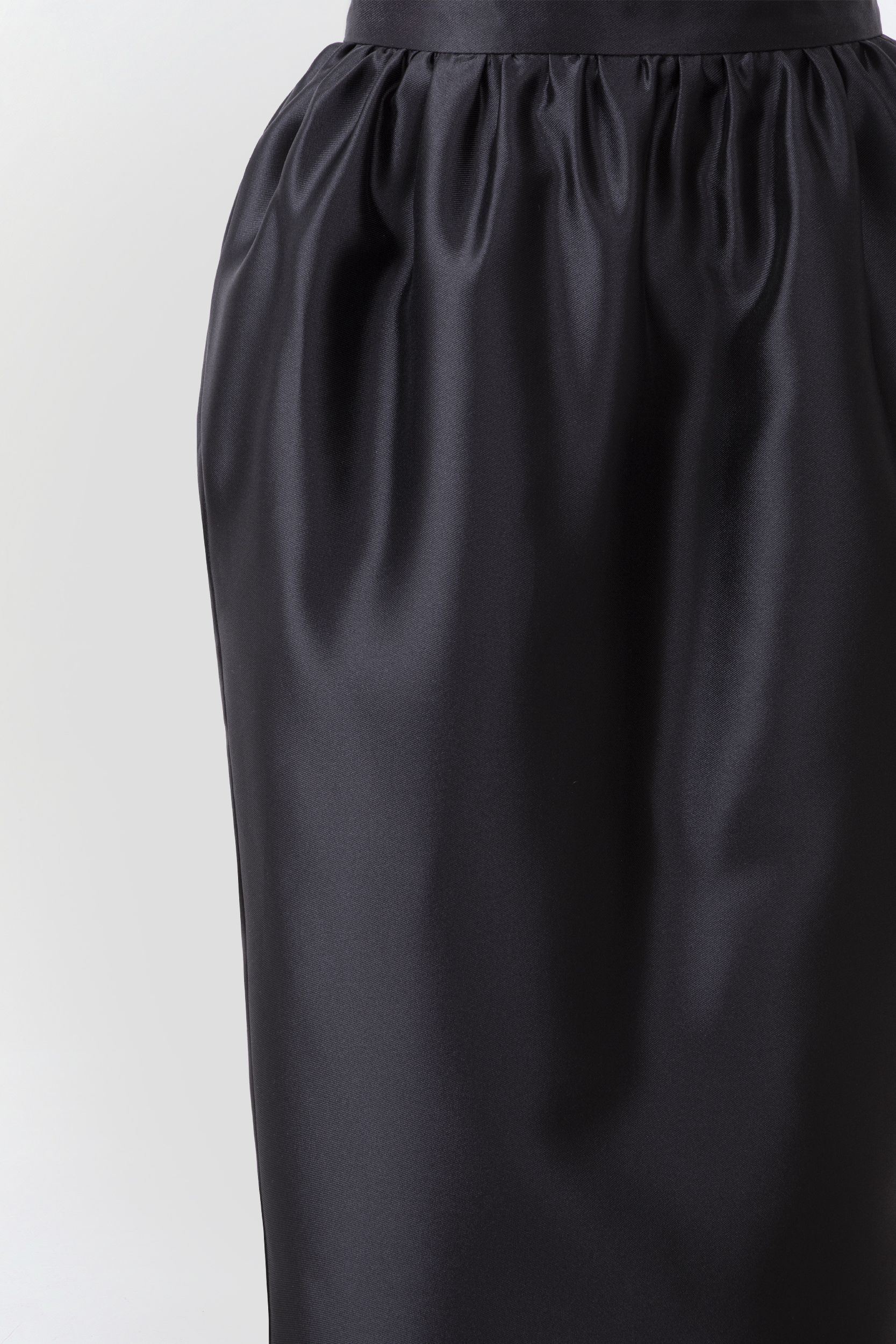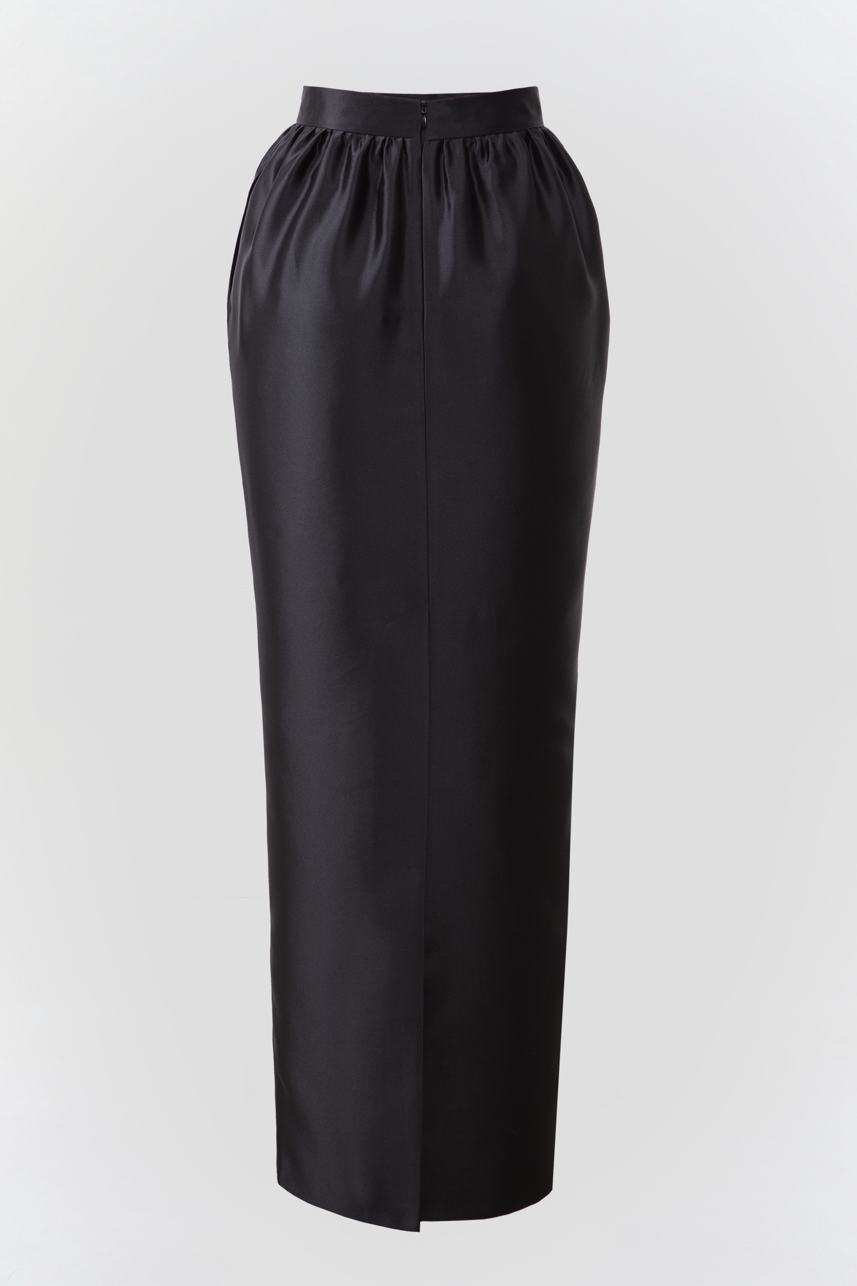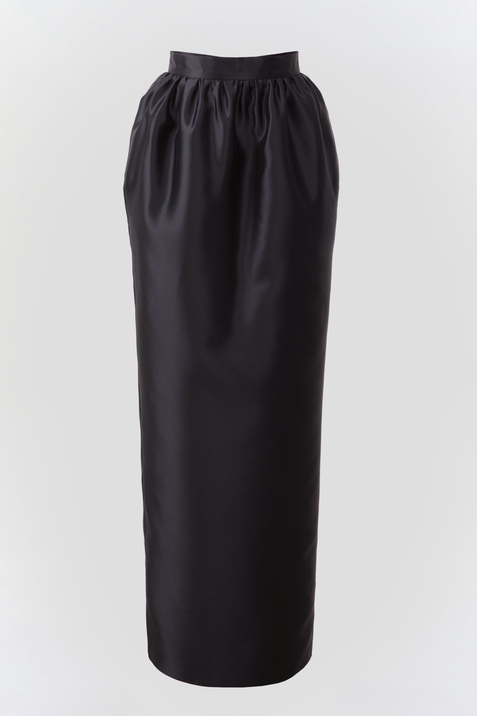 Черная юбка-макси из шелковой тафты с сатиновым блеском. Выверенная до идеала геометрия юбки и высокая посадка по талии удлиняет силуэт, а драпировка создает акцент на талии, визуально делая ее еще уже. Имеет высокую шлицу сзади и два глубоких боковых кармана. Юбка на шелковой подкладке, застегивается на потайную молнию по спинке.