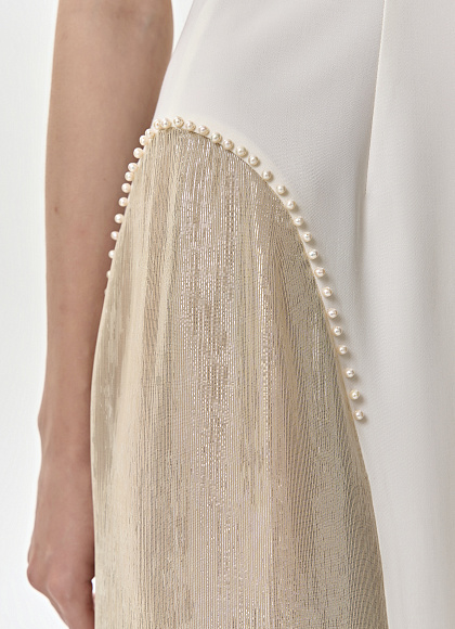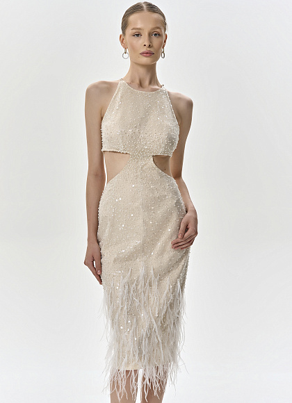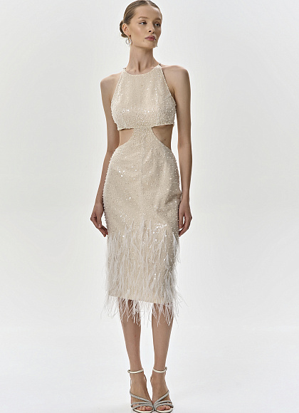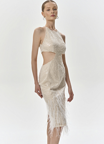 Шелковое платье-миди с вышивкой и перьями