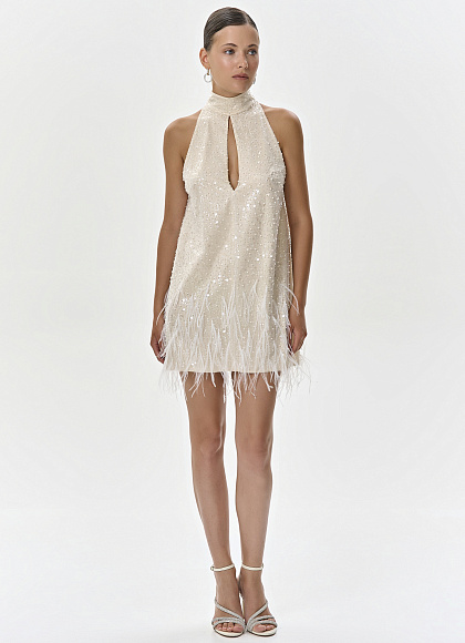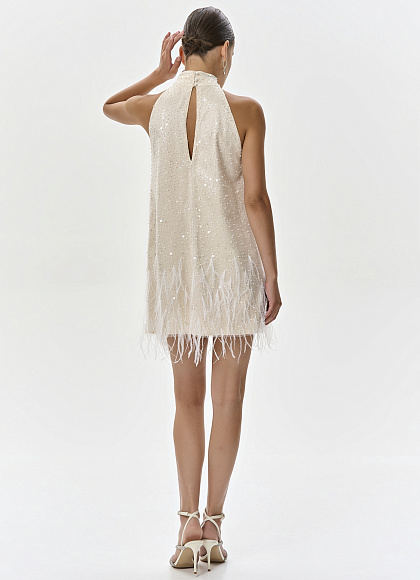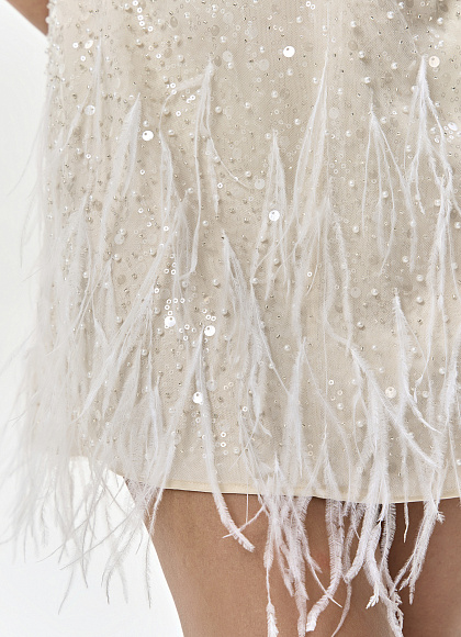Шелковое платье-мини с вышивкой и перьями