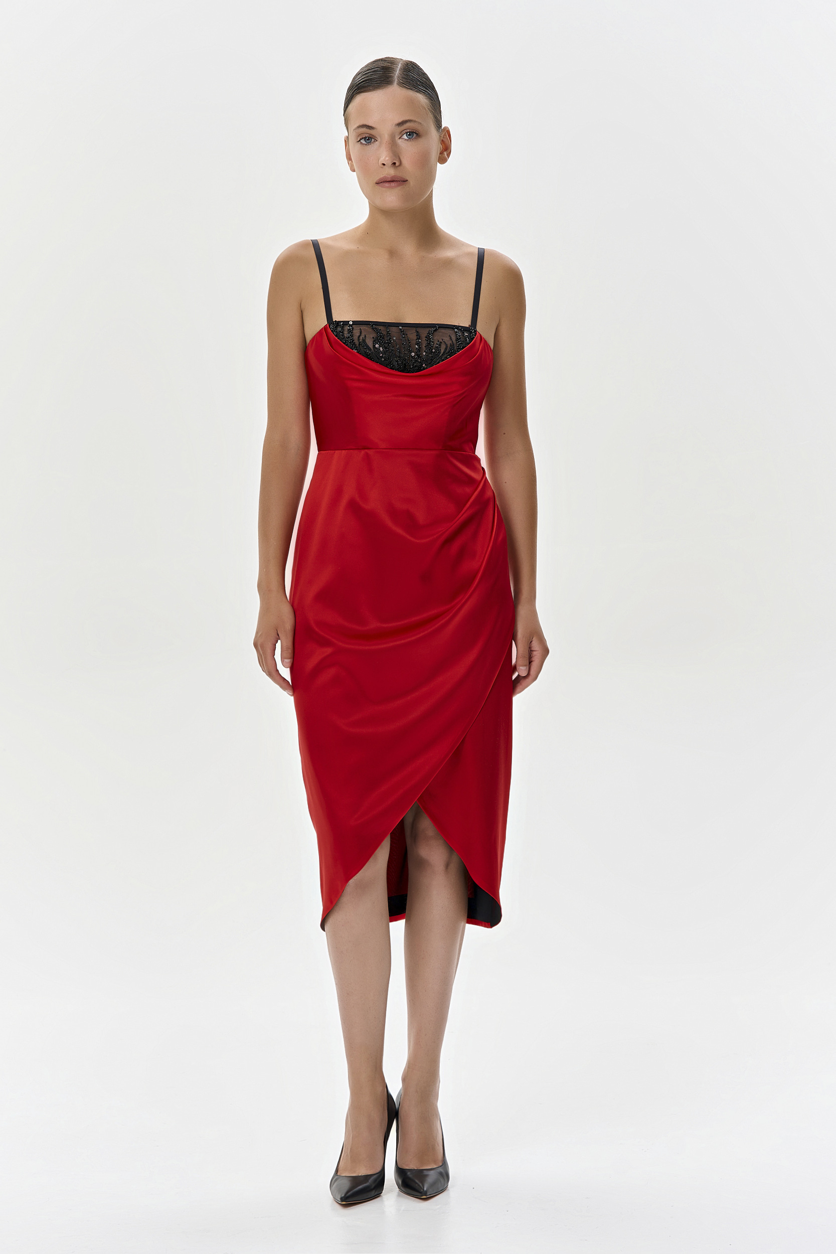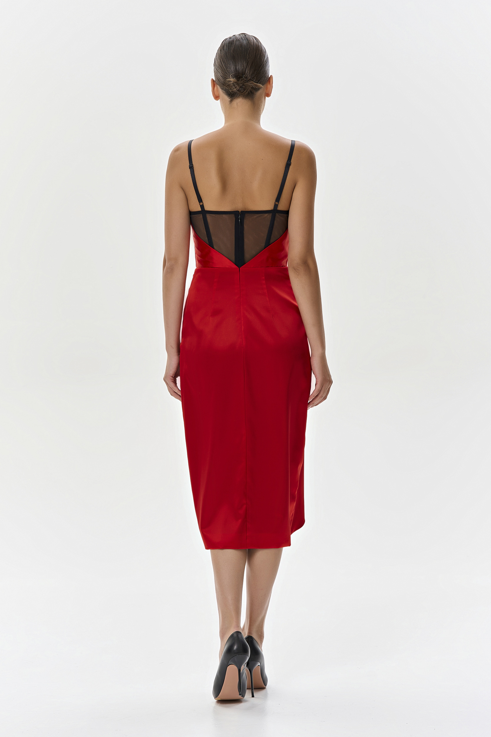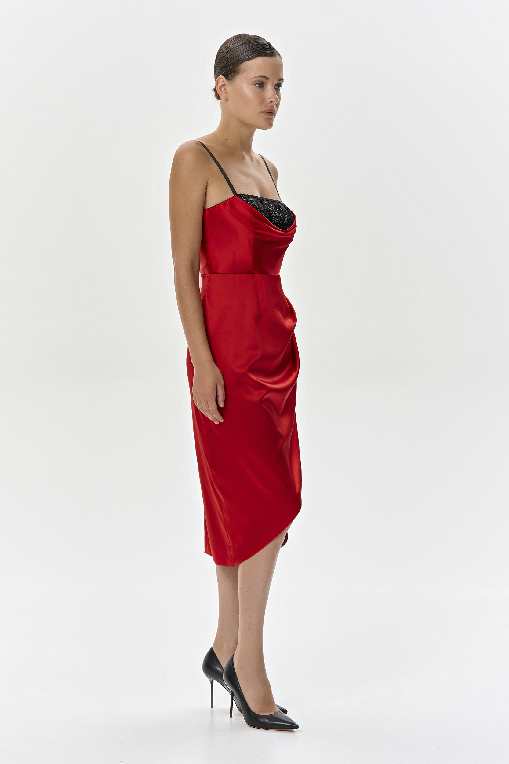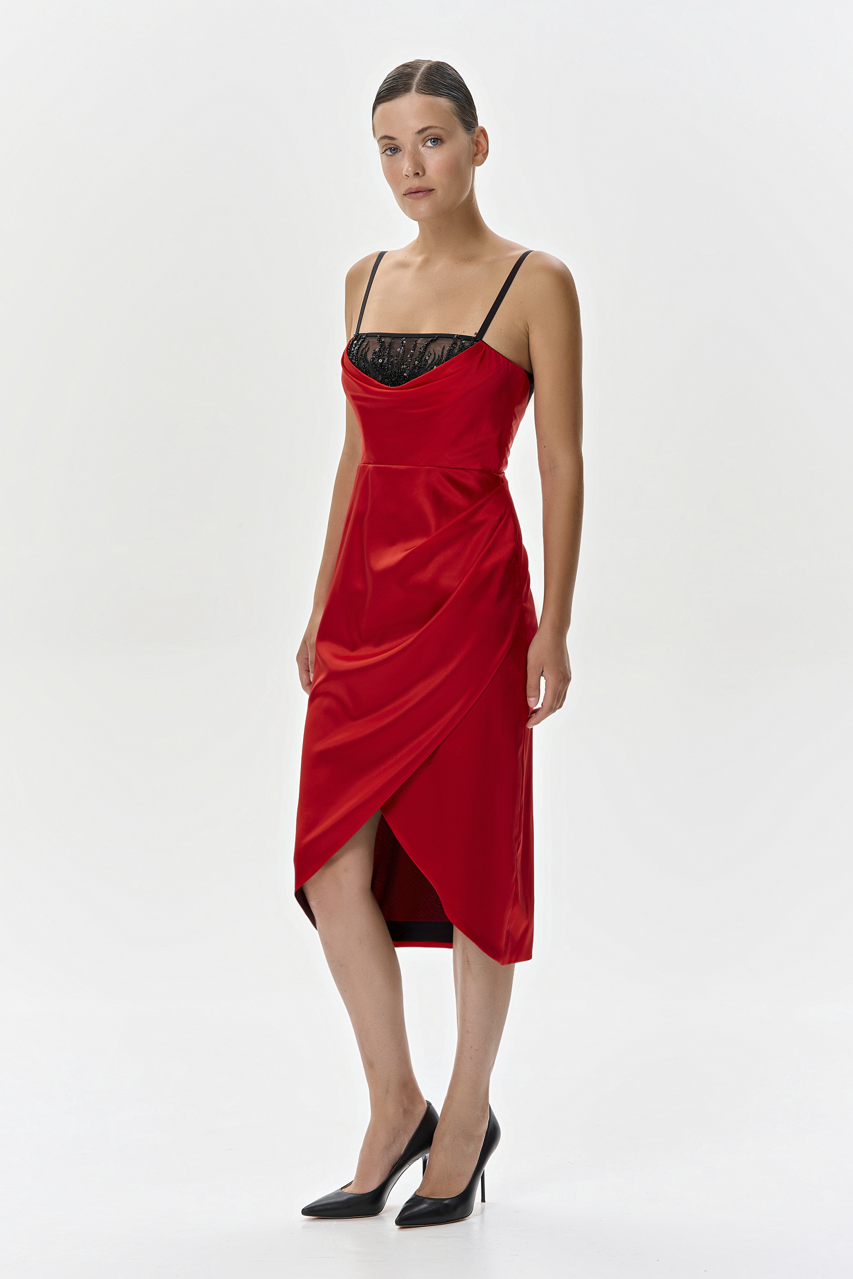 Красное платье-миди выполнено из атласного шелка. Корсетный верх выполнен из нежной сетки на контрасте, в черном цвете и декорирован вышивкой из бисера и пайеток. Вырез-качель изящно подчеркивает зону декольте. Юбка с драпировкой добавляет игру теней и подчеркивает роскошный цвет шелка. Платье на шелковой подкладке, застегивается на крючок и молнию по спинке. На создание вышивки мастерам потребовалось 82 часа работы. Платье создано в единственном экземпляре.